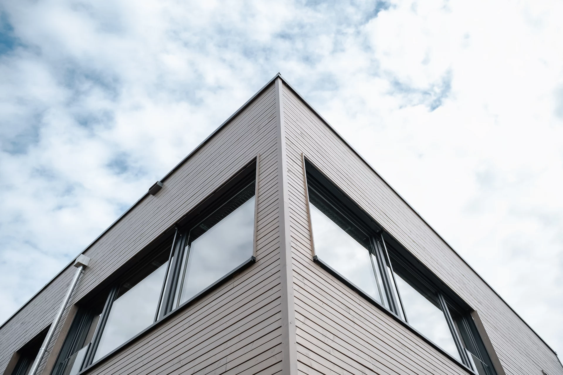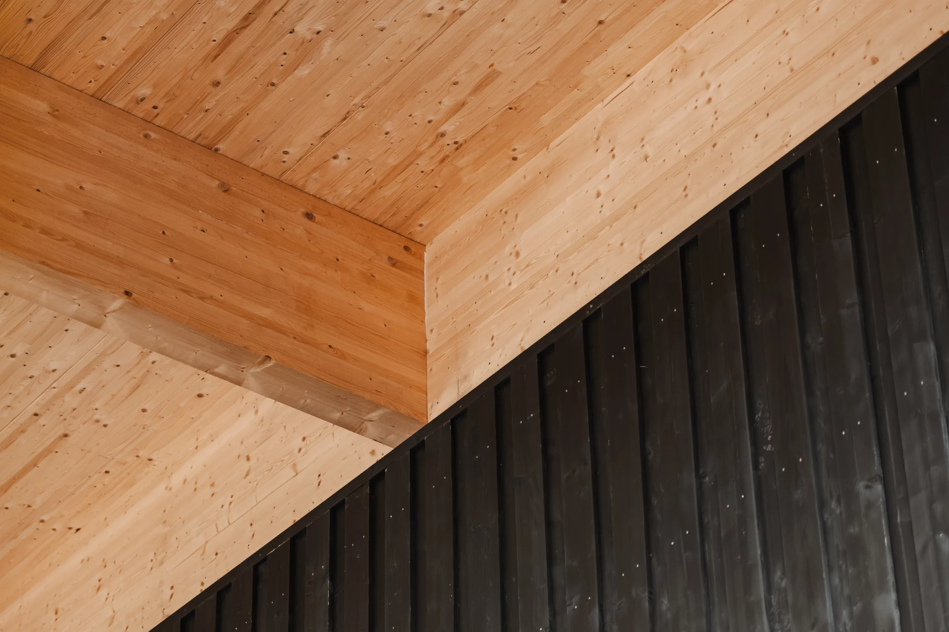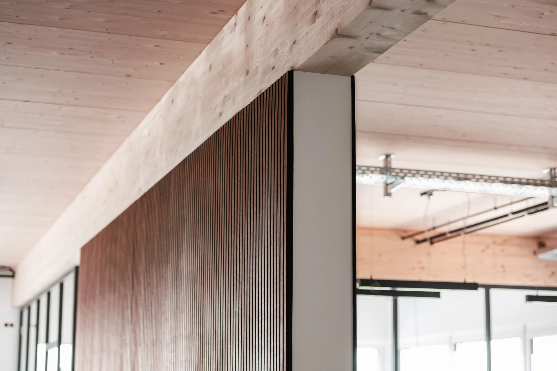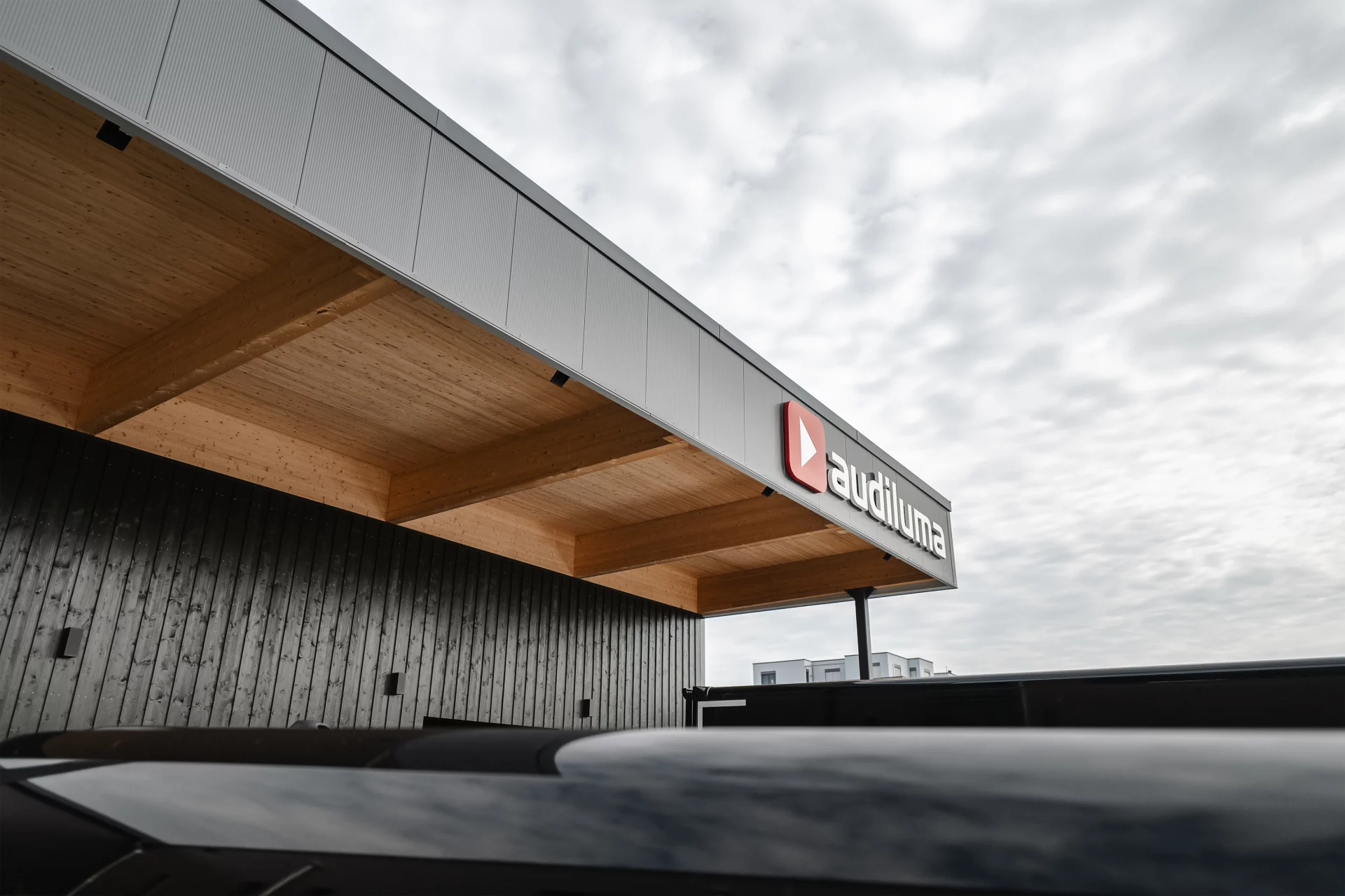 In Mainz-Lerchenberg, direkt neben dem ZDF-Hauptsitz, entstand für das international tätige Unternehmen Audiluma ein hochmoderner Neubau mit Lager-, Logistik- und Bürobereichen. Der Gebäudekomplex besteht aus zwei verbundenen Baukörpern: Die große Lagerhalle wurde mit einer eleganten schwarzen Sandwichfassade, einem Sandwichdach und eingehängten Pfetten realisiert. Ein Licht-Lüftungsfirst mit RWA-Klappen sorgt für optimale Belichtung und Belüftung. Unterhalb des Vordachs verleiht eine Holzfassade in BINZ-Color dem Bauwerk zuätzliche Ästhetik. Der Bürotrakt überzeugt mit BINZ-HolzMassivWänden, die für ein angenehmes Raumklima und hohe Energieeffizienz sorgen. Das Ergebnis ist ein funktional durchdachter, architektonisch ansprechender Firmensitz, der modernste Gebäudetechnik mit nachhaltigem Holzbau vereint.