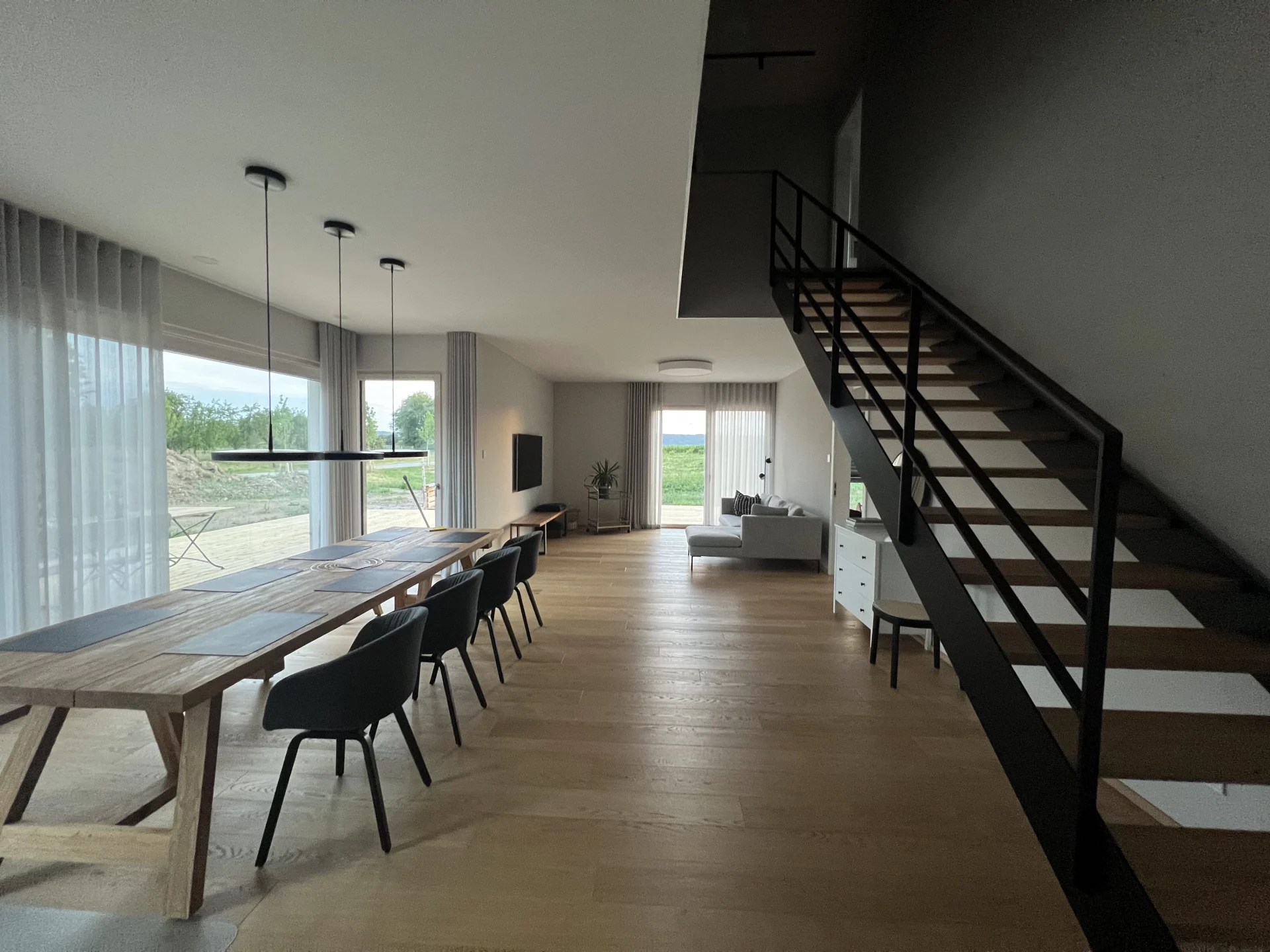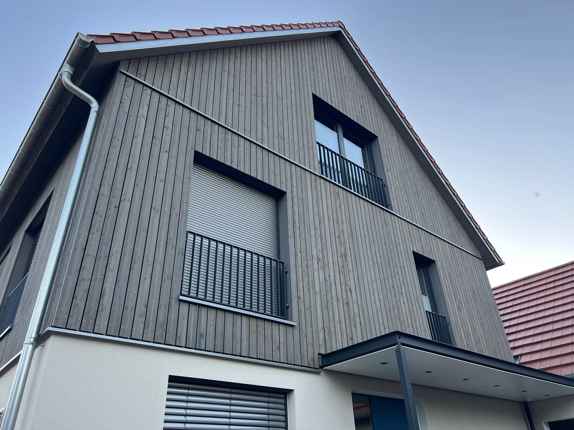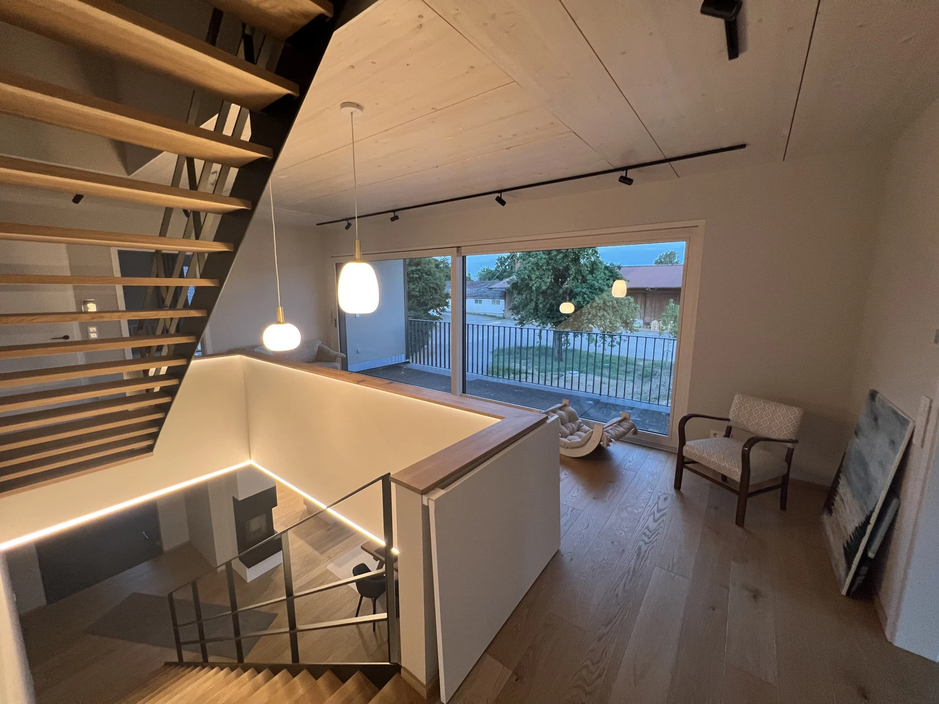 In Schwäbisch Hall entstand ein BINZ-HolzMassivHaus mit weißer Putzfassade im Erdgeschoss und einer eleganten Holzfassade in BINZ-Color für das Obergeschoss bis zum Dach. Die angebaute Garage verfügt über Sektionaltore auf beiden Seiten um höchste Flexibilität z.B. für Fahrzeuge und Geräte bieten, zu dem eine Zwischenebene. Im Innenbereich prägen Holzoptik bei Böden und Treppenstufen sowie anthrazitfarbene Stahlkonstruktionen für Geländer und Wangen den Übergang zwischen den Geschossen. Große Fenster und moderne Lichtplanung setzen Akzente, während BINZ-HolzMassivDecken und BINZ-HolzMassivWände für ein angenehmes, natürliches Raumklima sorgen.