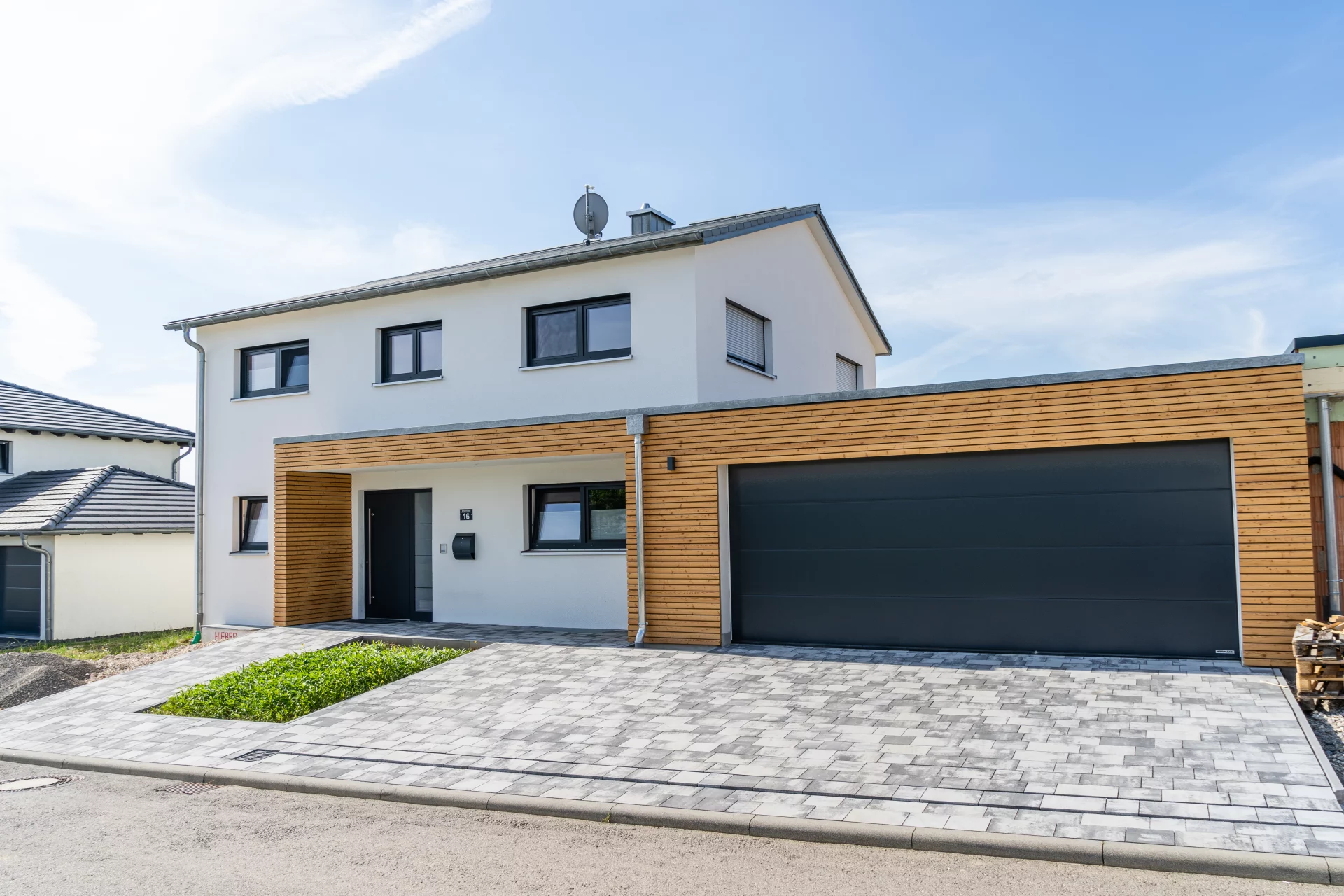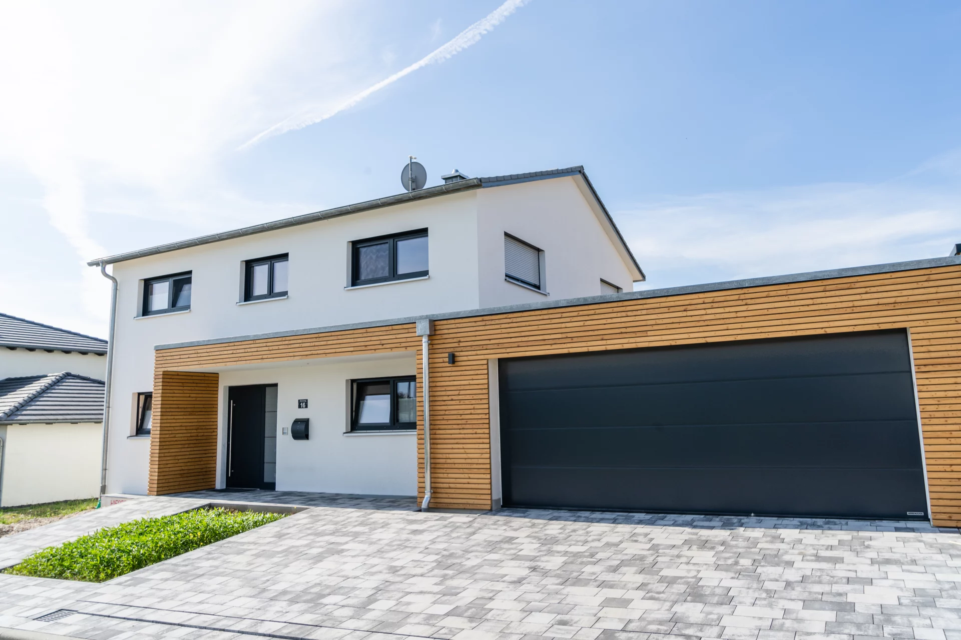 In Tannhausen entstand ein modernes BINZ-HolzMassivHaus mit angebauter Garage, das durch seine durchdachte Gestaltung und die Kombination aus Putz- und Holzfassade überzeugt. Die Garage wurde mit einem Flachdach sowie einem anthrazitfarbenen Sektionaltor ausgeführt und erhält durch die umlaufende Holzfassade – die auch den Eingangsbereich samt Vordach einfasst – einen warmen, natürlichen Charakter. Das Wohnhaus selbst zeigt sich mit einer klaren Putzfassade, während Fensterbeschläge und Eingangstür in Anthrazit für einen modernen, ruhigen Kontrast sorgen. Auf der Gebäuderückseite setzt in einem weiteren Teilbereich die Holzfassade einen stimmigen Akzent und gestaltet den Zugang zur Terrasse besonders einladend. So entsteht ein Wohnensemble, das die Vorteile der BINZ-HolzMassivBauweise mit einer harmonischen, zeitgemäßen Architektur verbindet.