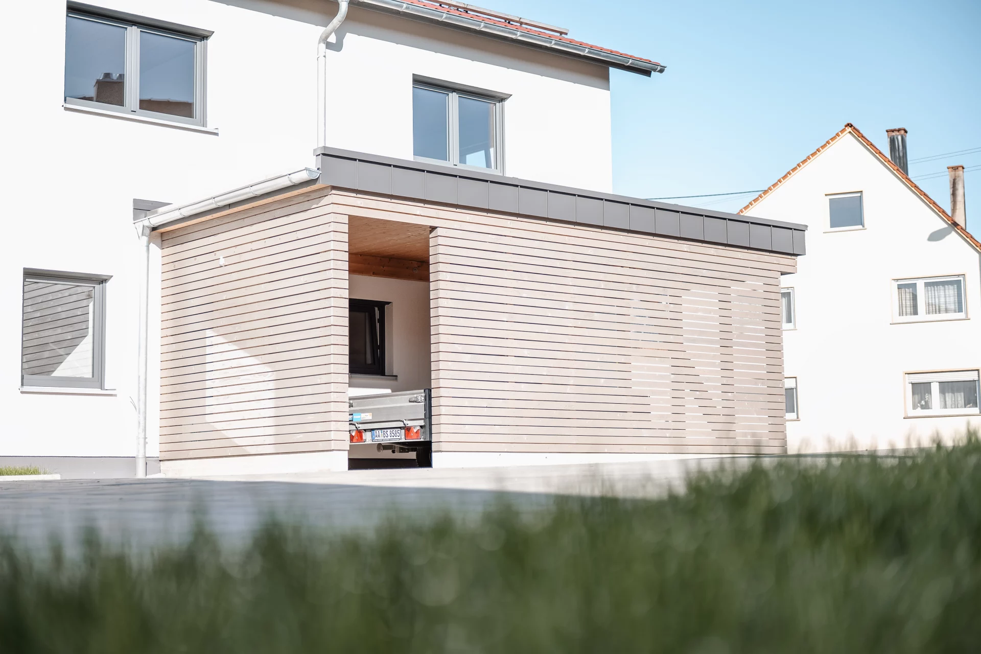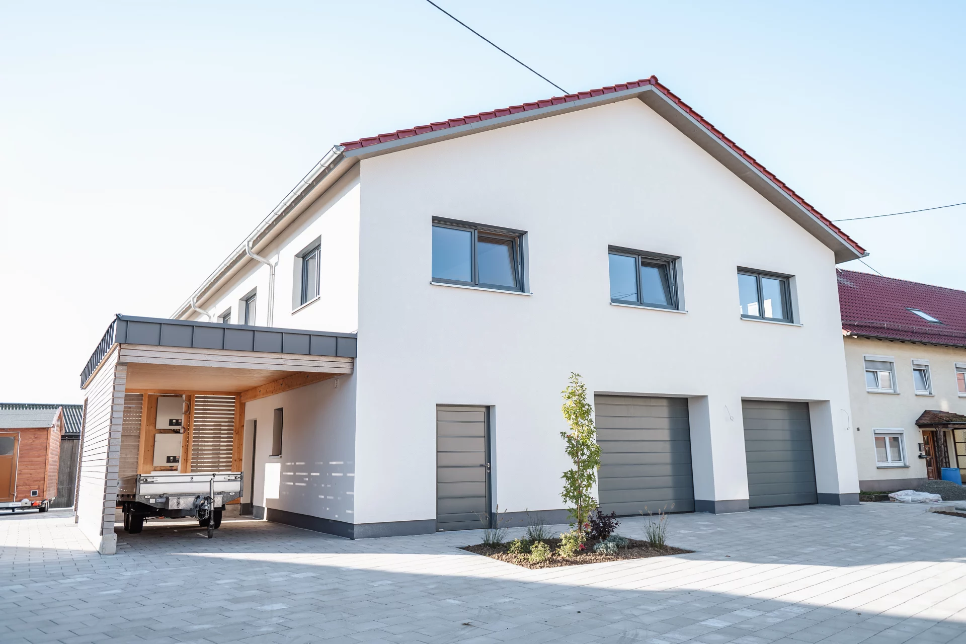 In Pfahlheim entstand ein modernes BINZ-HolzMassivHaus, das durch seine natürliche Bauweise und klare Formensprache besticht. Das Wohnhaus wurde mit sichtbaren Holzbalken und einer massiven Holzdecke realisiert – für ein warmes, behagliches Wohngefühl. Die Wände bestehen aus der hochwertigen BINZ-HolzMassivWand, die für ein gesundes Raumklima und hervorragende Energieeffizienz sorgt. Ergänzt wird das Ensemble durch ein Nebengebäude, das als Heizzentrale dient, sowie einen Carport, der harmonisch an das Wohnhaus anschließt. Ein stimmiges Gesamtprojekt, das modernes Wohnen und nachhaltige Bauweise vereint.