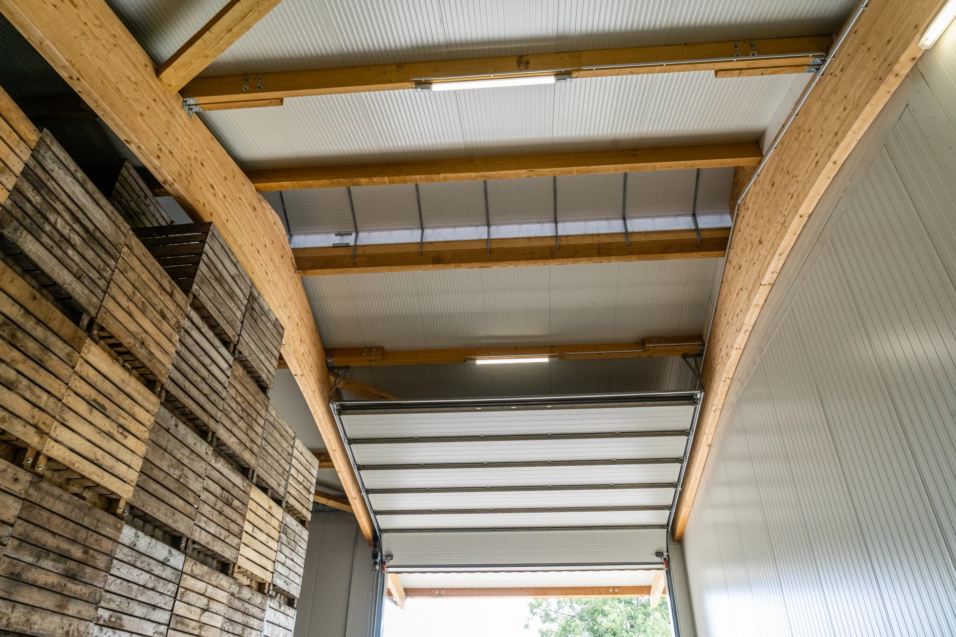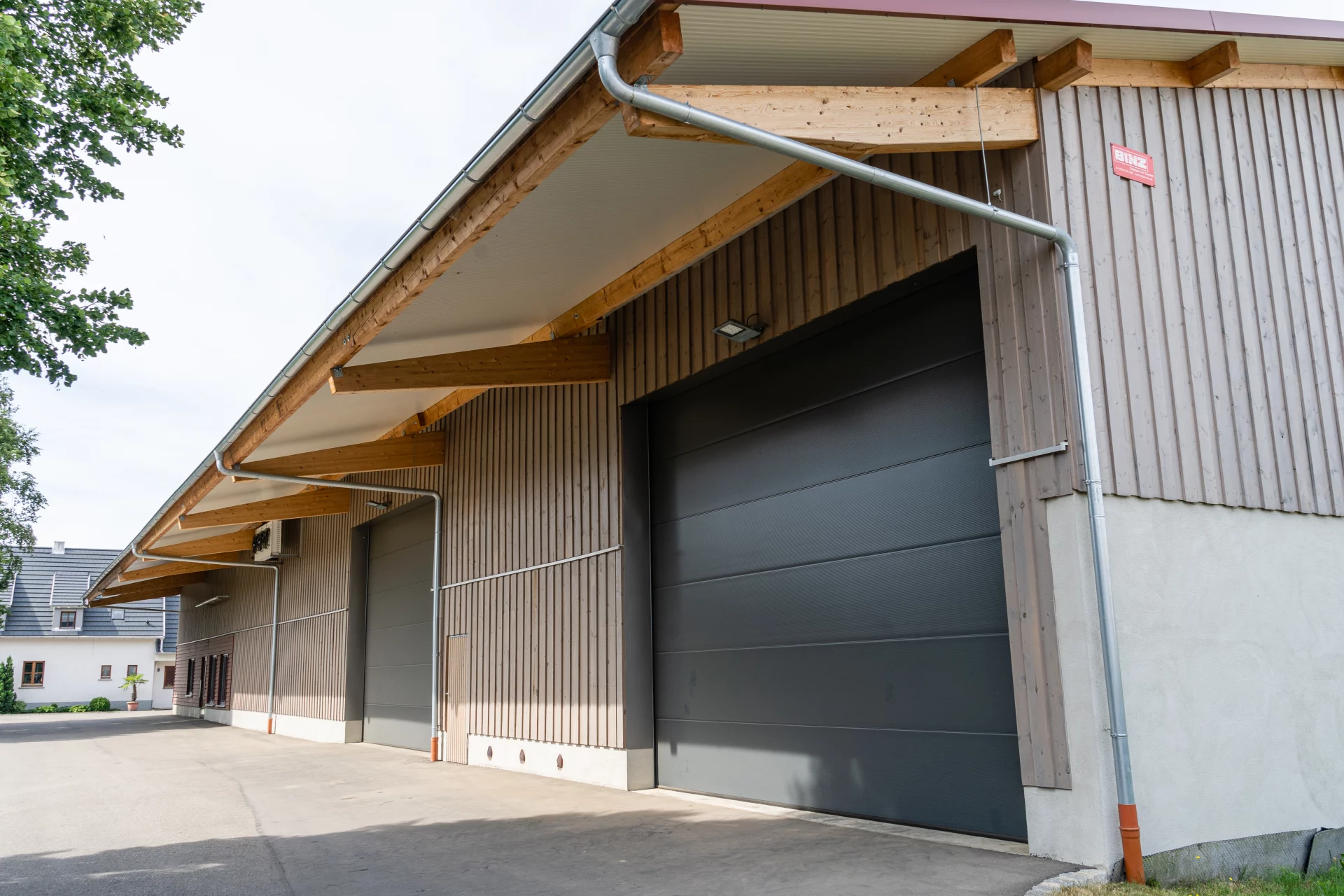 Eine landwirtschaftliche Mehrzweckhalle in Langenau überzeugt hier als moderne Kartoffellagerhalle mit integriertem Verlade- und Verkaufsbereich. Die BINZ-Color Holzfassade unterteilt die Halle optisch in zwei Ebenen: vertikal angebracht für den Lagerbereich und horizontal im Bereich des Hofladens. Praktische Sektionaltore erleichtern die Abläufe und verbinden Funktionalität mit einem ansprechenden Erscheinungsbild. So entsteht eine vielseitig nutzbare Lager- und Verkaufshalle mit hohem Mehrwert.
