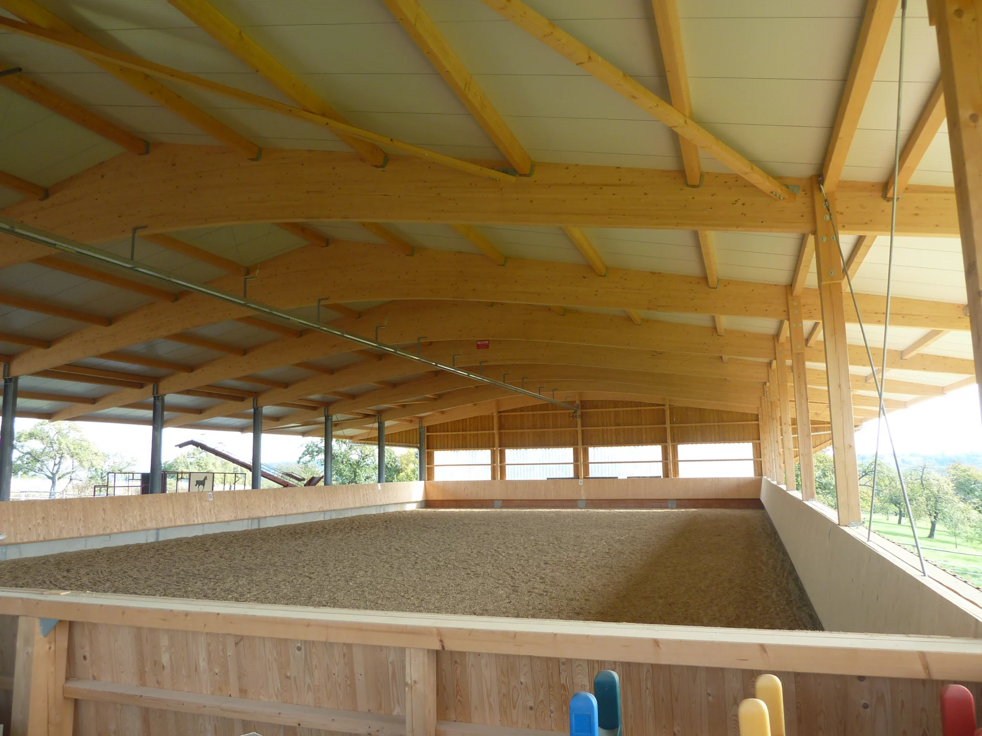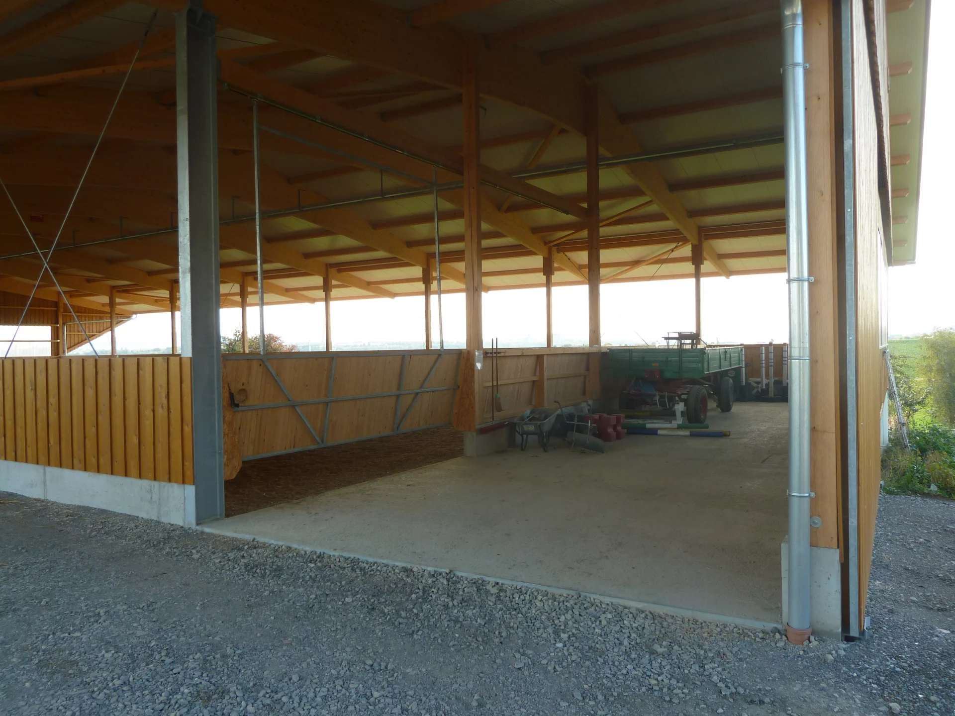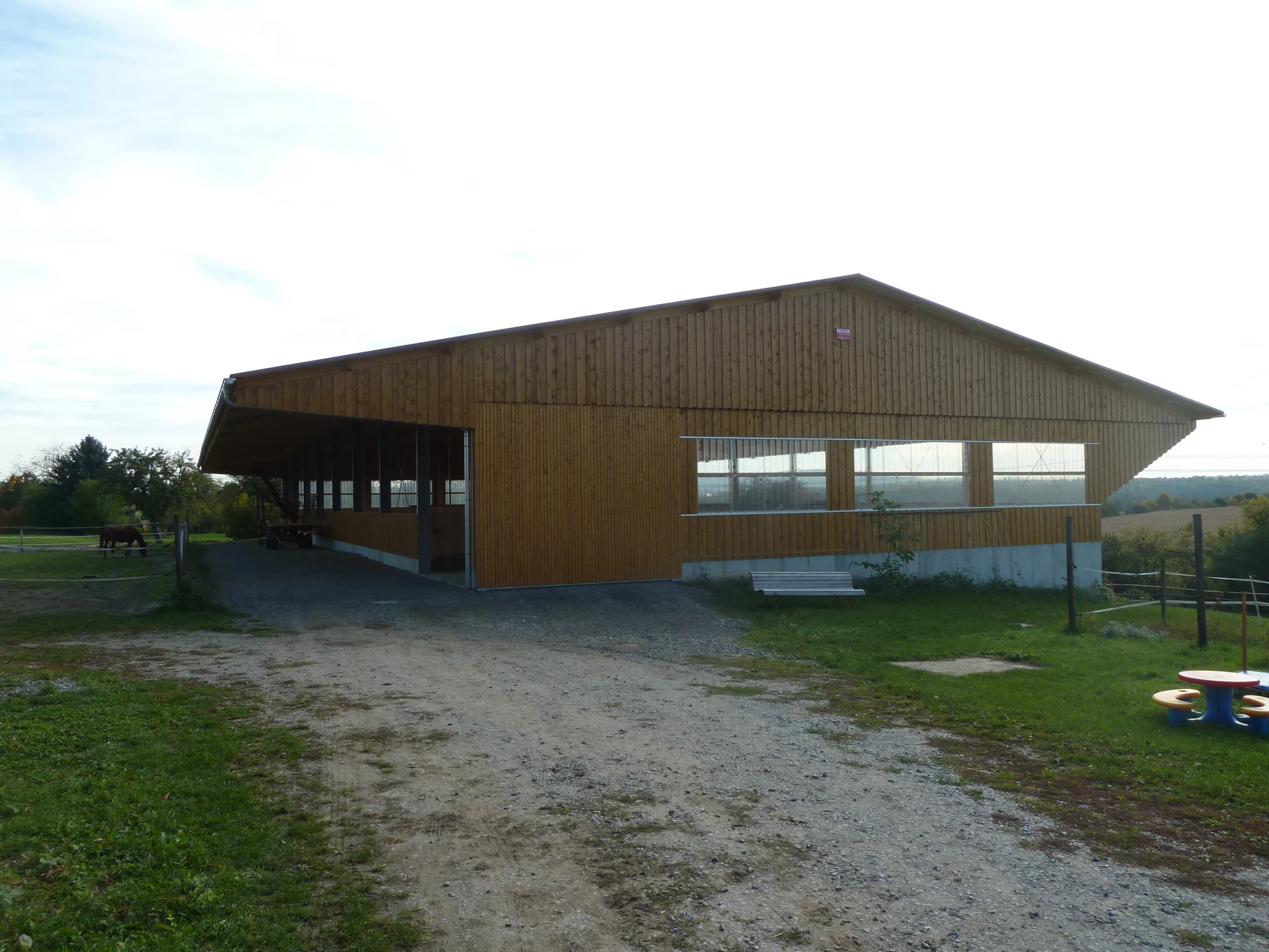 In Kornwestheim entstand eine moderne Reithalle, die durch ihre vielseitige Nutzung überzeugt. Der Teilbereich kann flexibel als Verkaufsfläche oder Lagerbereich genutzt werden. Das Gebäude wurde teils mit Stahlstützen, als auch mit Holzstützen umgesetzt und einem Sandwichdach realisiert – für ein angenehmes Raumklima und hohe Energieeffizienz. Eingehängte Pfetten mit verdeckten Anschlüssen sorgen für eine klare, technisch durchdachte Konstruktion und ein ästhetisch stimmiges Gesamtbild.