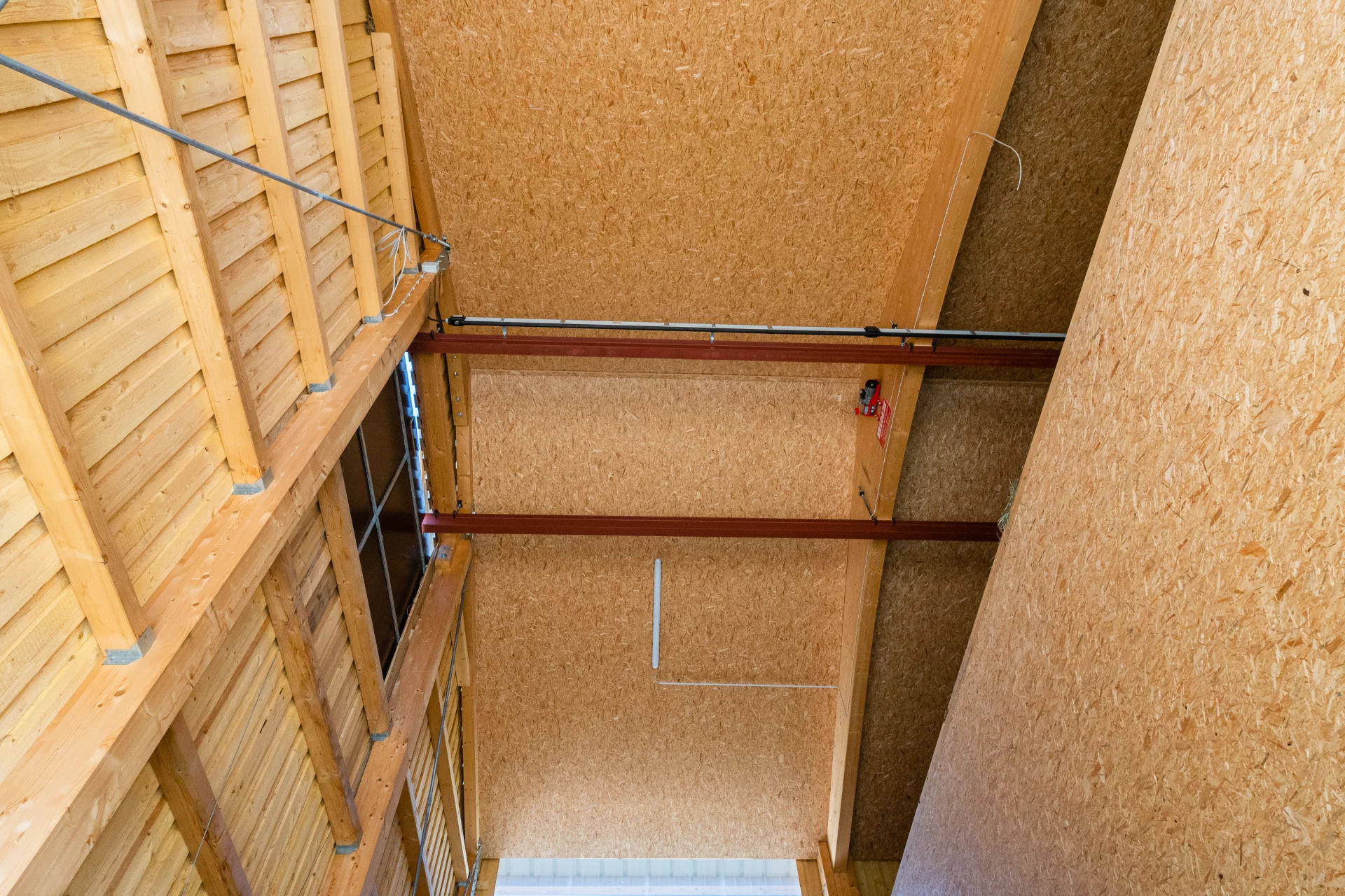Diese Heulagerhalle kombiniert durchdachte Planung mit präziser Ausführung: Ein integrierter Heukran läuft auf stabilen Laufschienen, die direkt an den statisch berechneten Brettschichtholzträgern befestigt sind. Trennwände ermöglichen eine flexible Einlagerung des Heus in separaten Boxen. Die unbehandelte Holzfassade aus Sägeholz sorgt für eine natürliche Optik, während das Trapezblechdach mit unterseitigen Holzplatten eine optimale Belüftung für die Heutrocknung gewährleistet – robust, funktional und langlebig.