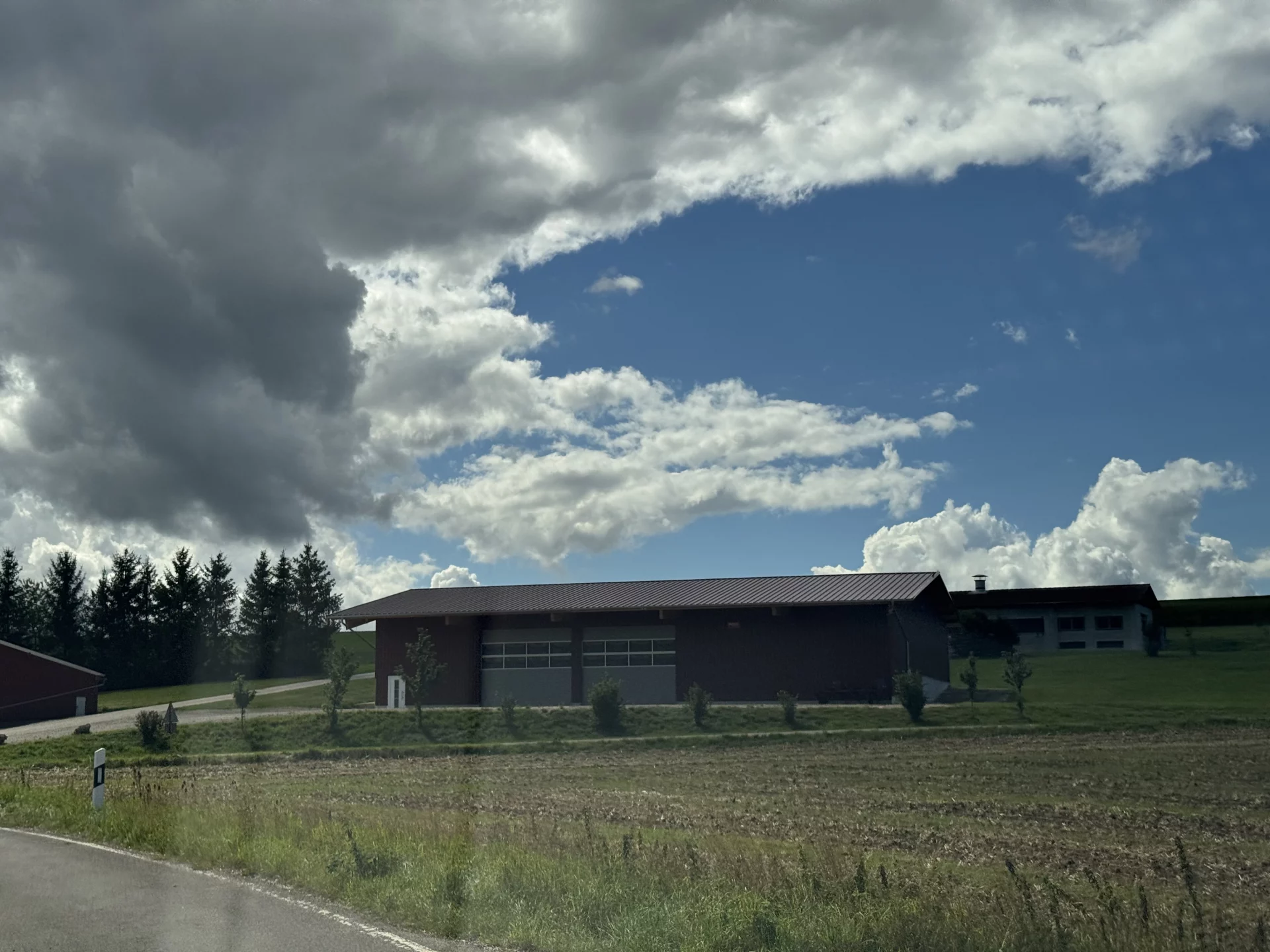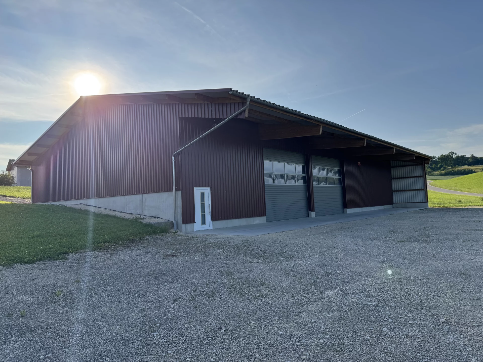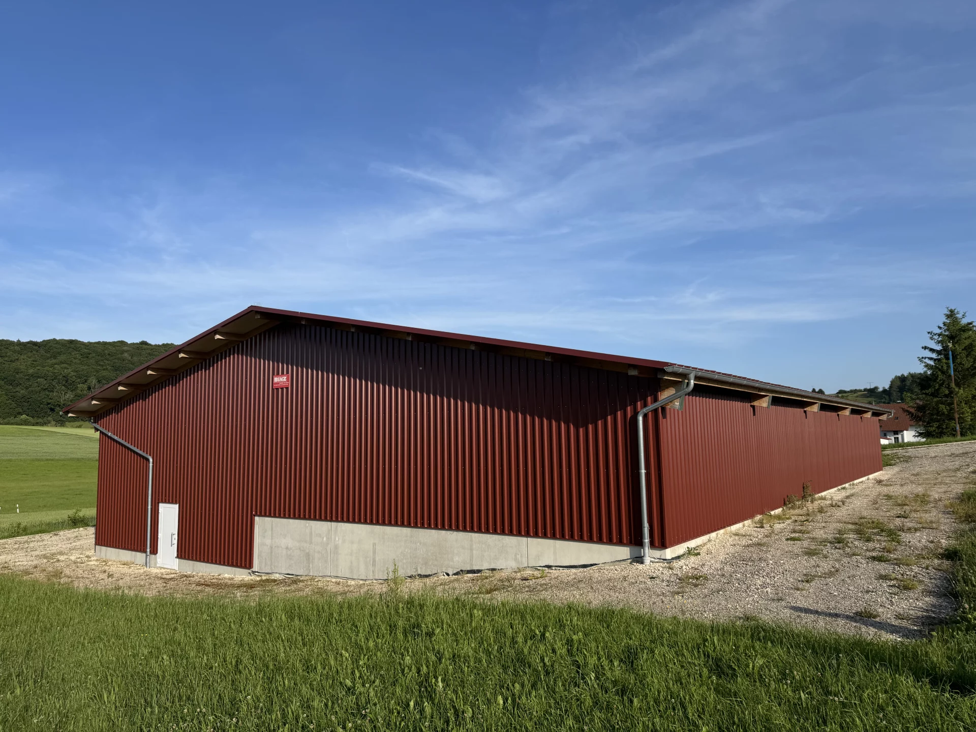 Für den landwirtschaftlichen Betrieb Haible entstand in Gerstetten-Heuchstetten eine vielseitig nutzbare Mehrzweckhalle mit robustem Trapezblech in warmem Rotbraun. Ein großzügiges Vordach schützt die Einfahrtsseite, während Seitenbacken an der Wetterseite zusätzlichen Schutz bieten. Zwei große Sektionaltore ermöglichen eine komfortable Einfahrt und flexible Nutzung. Der erhöhte Sockel gleicht das Gelände aus und sorgt für eine harmonische Einbindung des Gebäudes in die Umgebung.