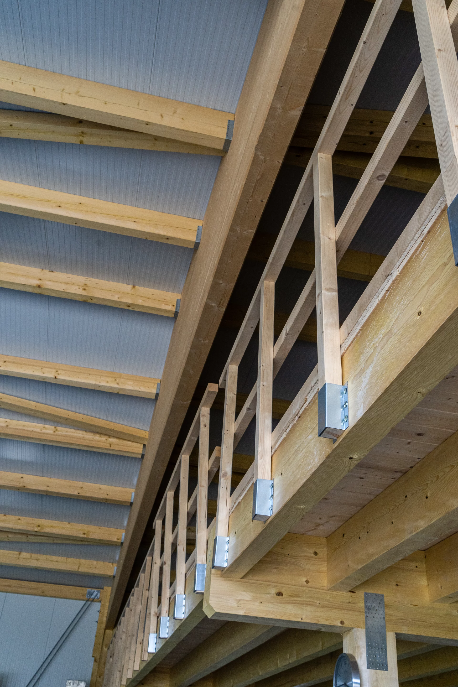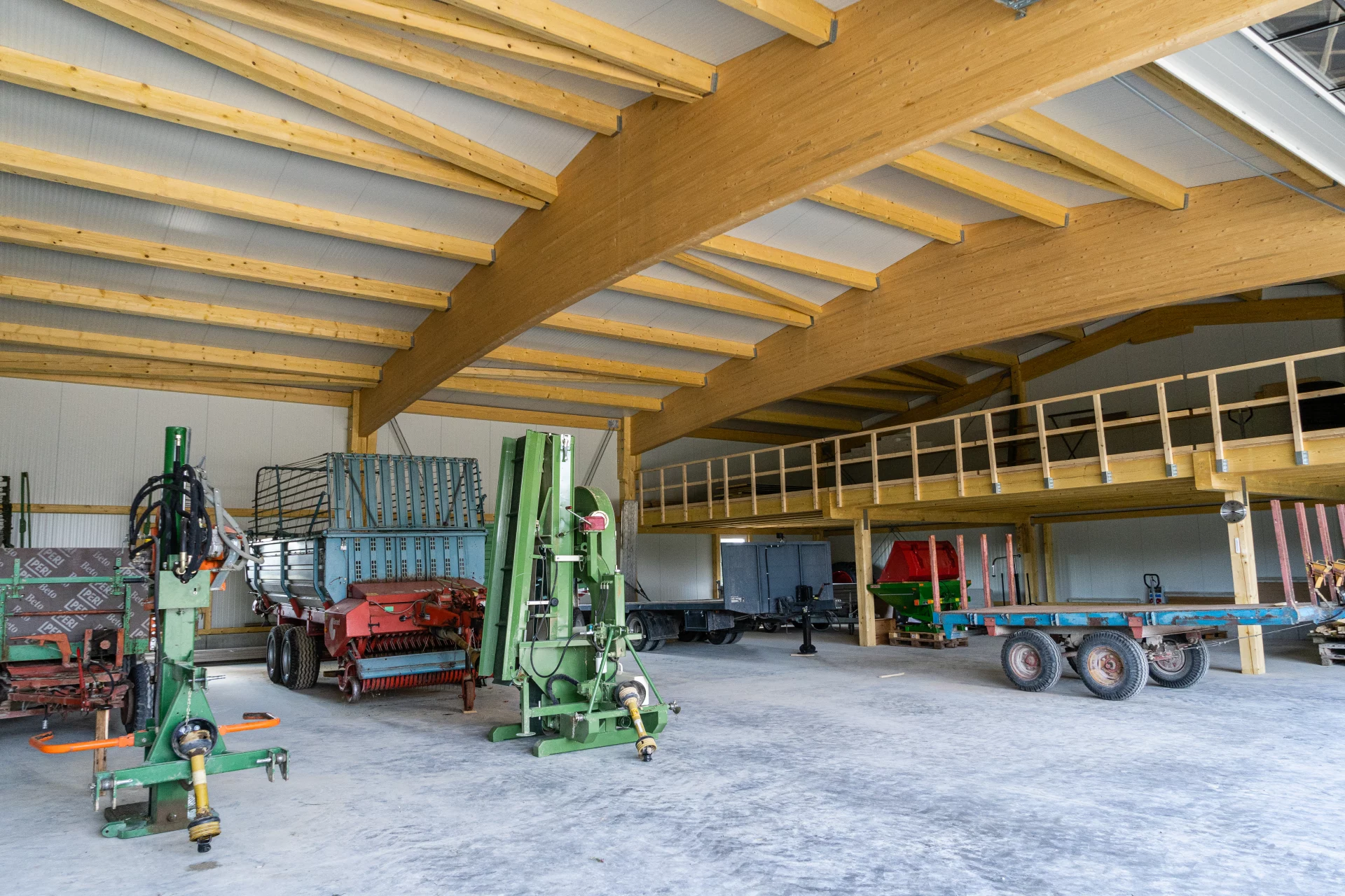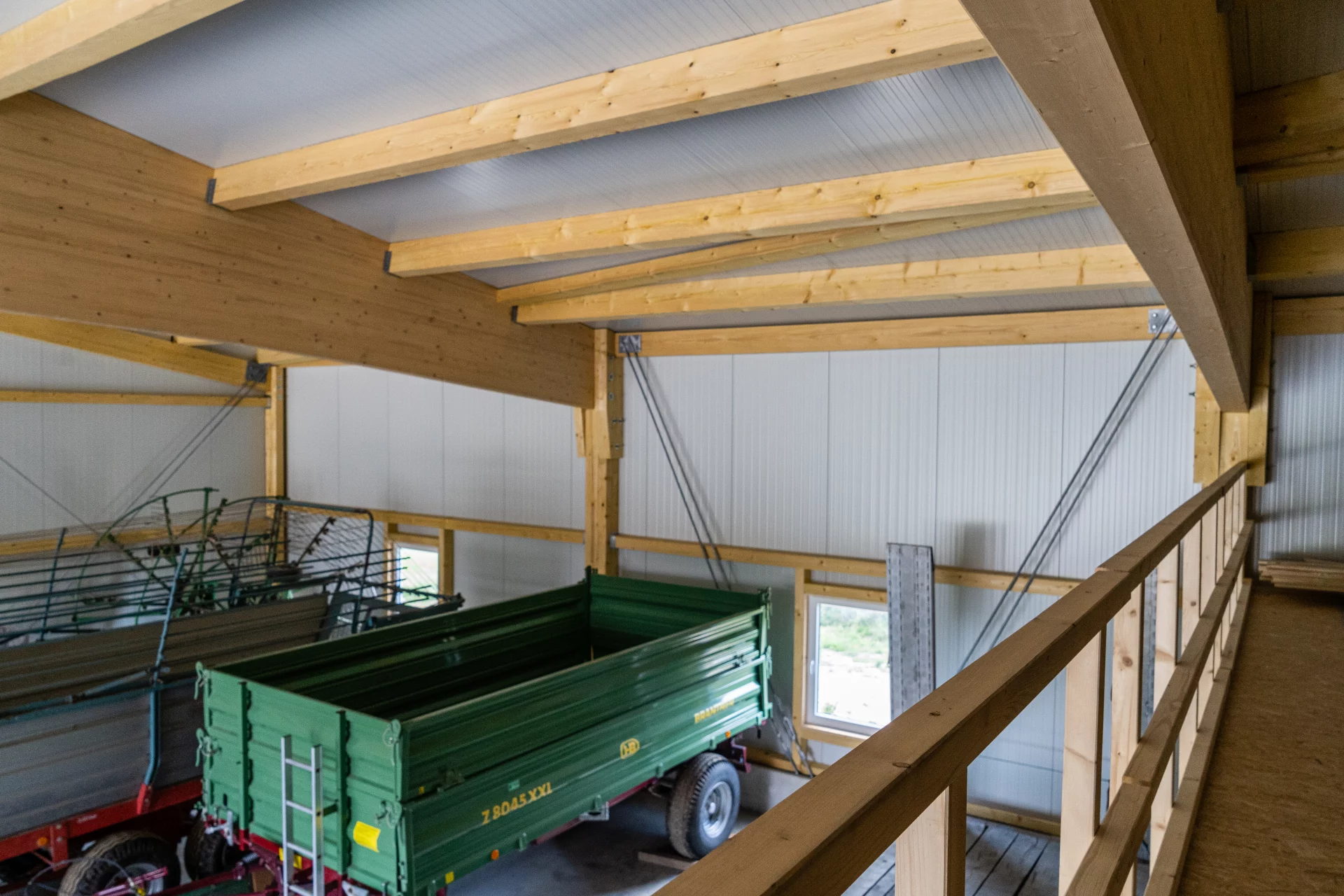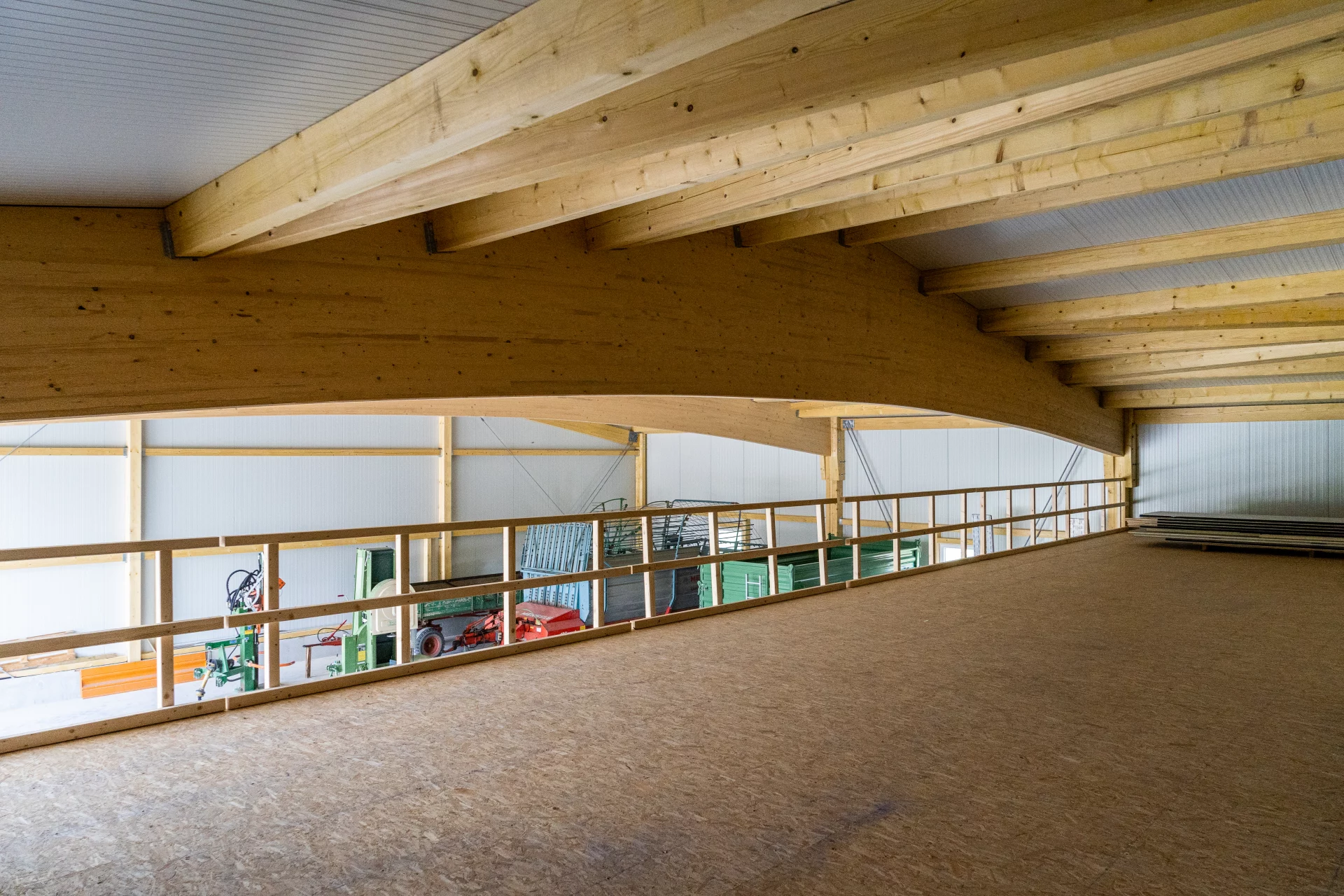 In Königsbronn entstand eine landwirtschaftliche Mehrzweckhalle mit durchdachter Dämmung durch Sandwichdach und Sandwichfassade. Großzügige Sektionaltore ermöglichen komfortable Zufahrten und flexible Nutzung. Eine integrierte Zwischenebene mit Treppe aus Holzwangen und Stahlgitterrostrippen erweitert den Raum funktional. Die Konstruktion mit eingehängten Pfetten sorgt für hohe Stabilität und Langlebigkeit – perfekt abgestimmt auf moderne landwirtschaftliche Anforderungen.