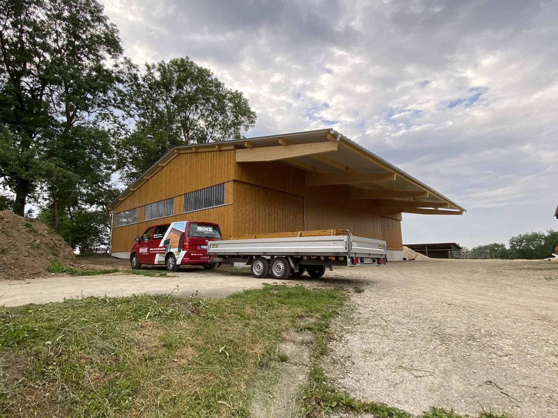 Für einen landwirtschaftlichen Lohnbetrieb in Olchingen entstand eine vielseitige Maschinen- und Lagerhalle mit beeindruckendem, 6 m weit auskragendem Vordach. Die großzügigen Binderabstände sorgen für eine außergewöhnlich breite Einfahrt und erleichtern das Rangieren mit Großmaschinen. Schiebetore ermöglichen flexible Öffnungsbreiten sowie robuste Alltagstauglichkeit. Die BINZ-Color Holzfassade im warmen Eiche-Farbton fügt sich harmonisch in die Umgebung ein und verleiht dem Gebäude eine hochwertige, langlebige Optik.