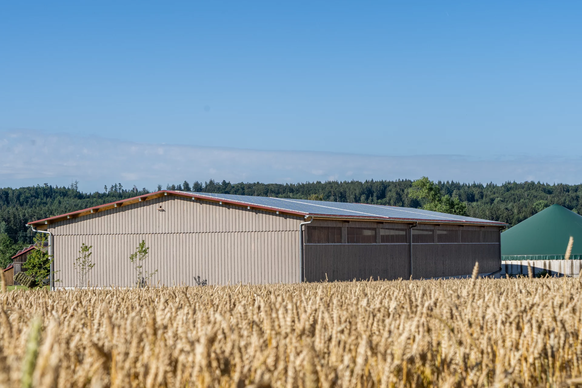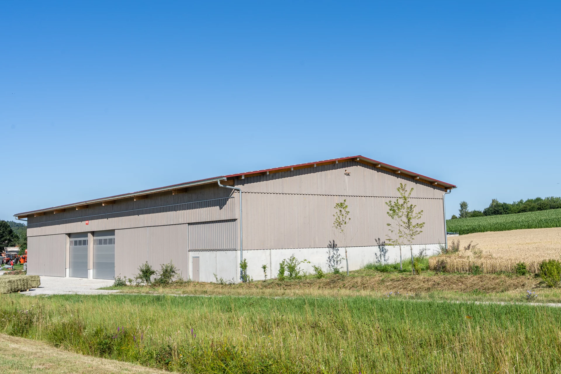 In Gumpenweiler entstand eine 22 x 46 m große landwirtschaftliche Mehrzweckhalle mit beeindruckender freitragender Konstruktion. Die integrierten Schüttboxen bieten flexible Lagermöglichkeiten, während groß dimensionierte Schiebetore Einfahrtsbreiten von bis zu 12,5 m ermöglichen. Ergänzt durch Sektionaltore, eine hochwertige BINZ-Color-Fassade und ein langlebiges Sandwichdach vereint das Gebäude Funktionalität, Stabilität und moderne Optik – ideal für vielseitige landwirtschaftliche Nutzung.