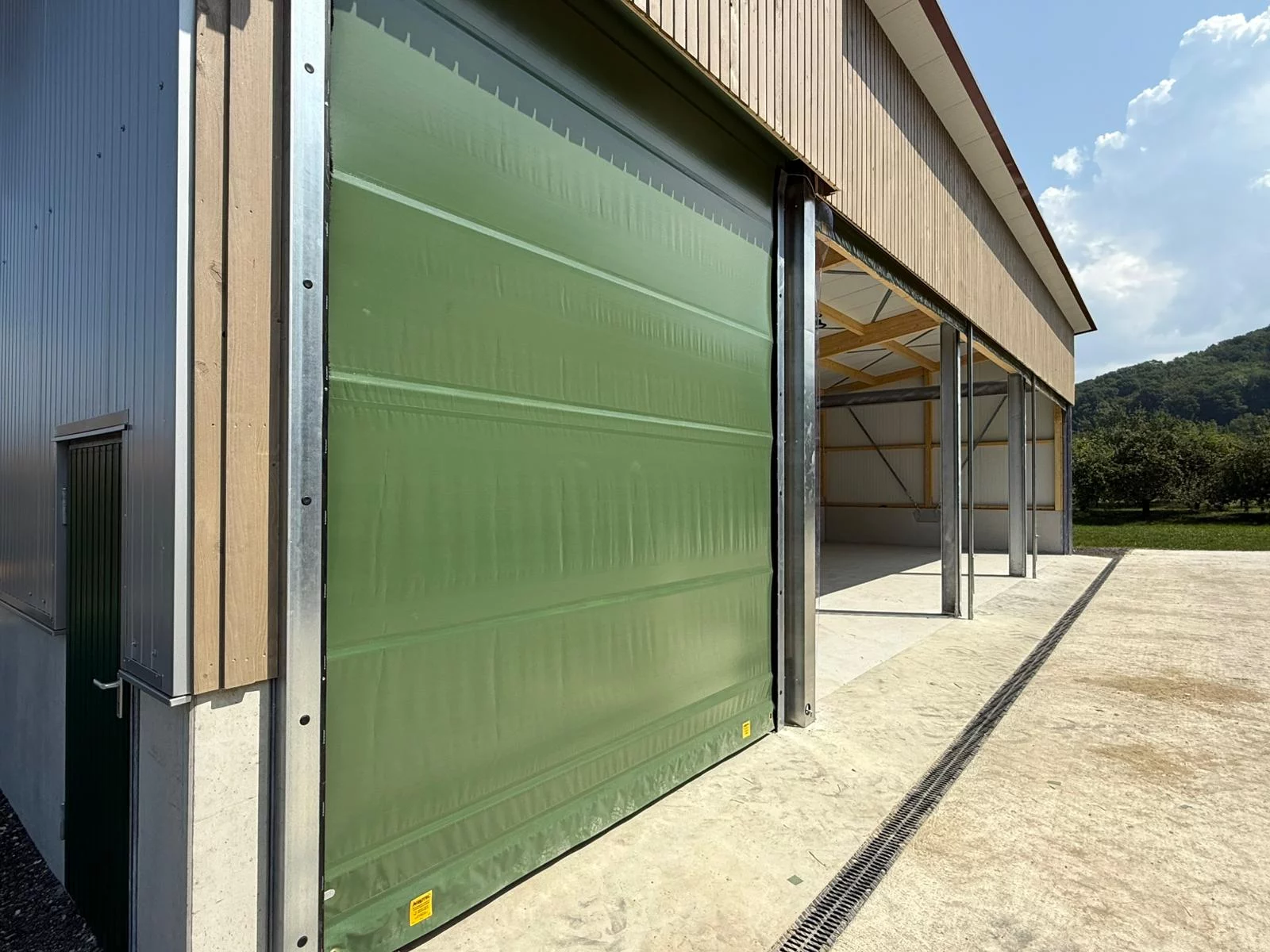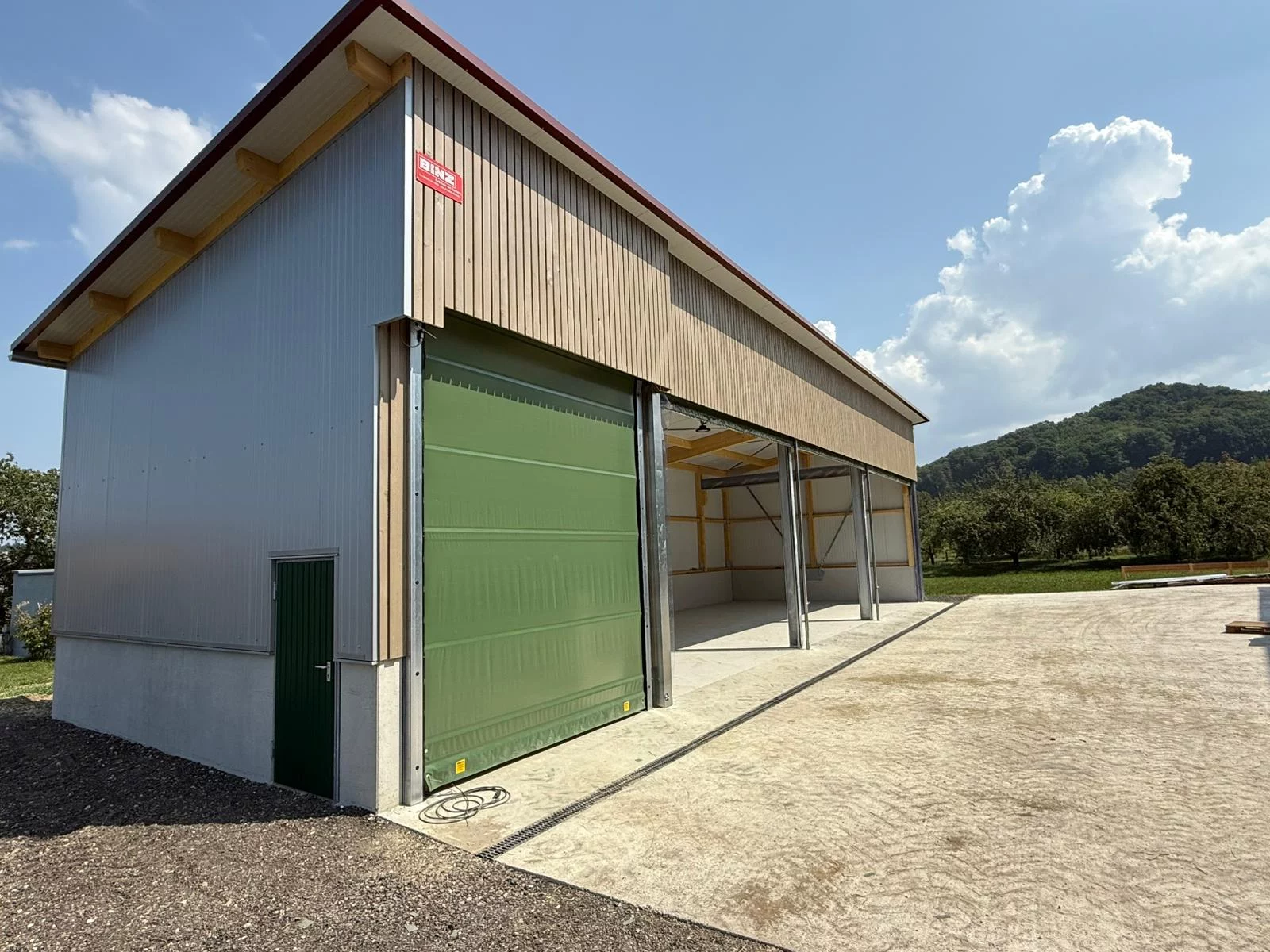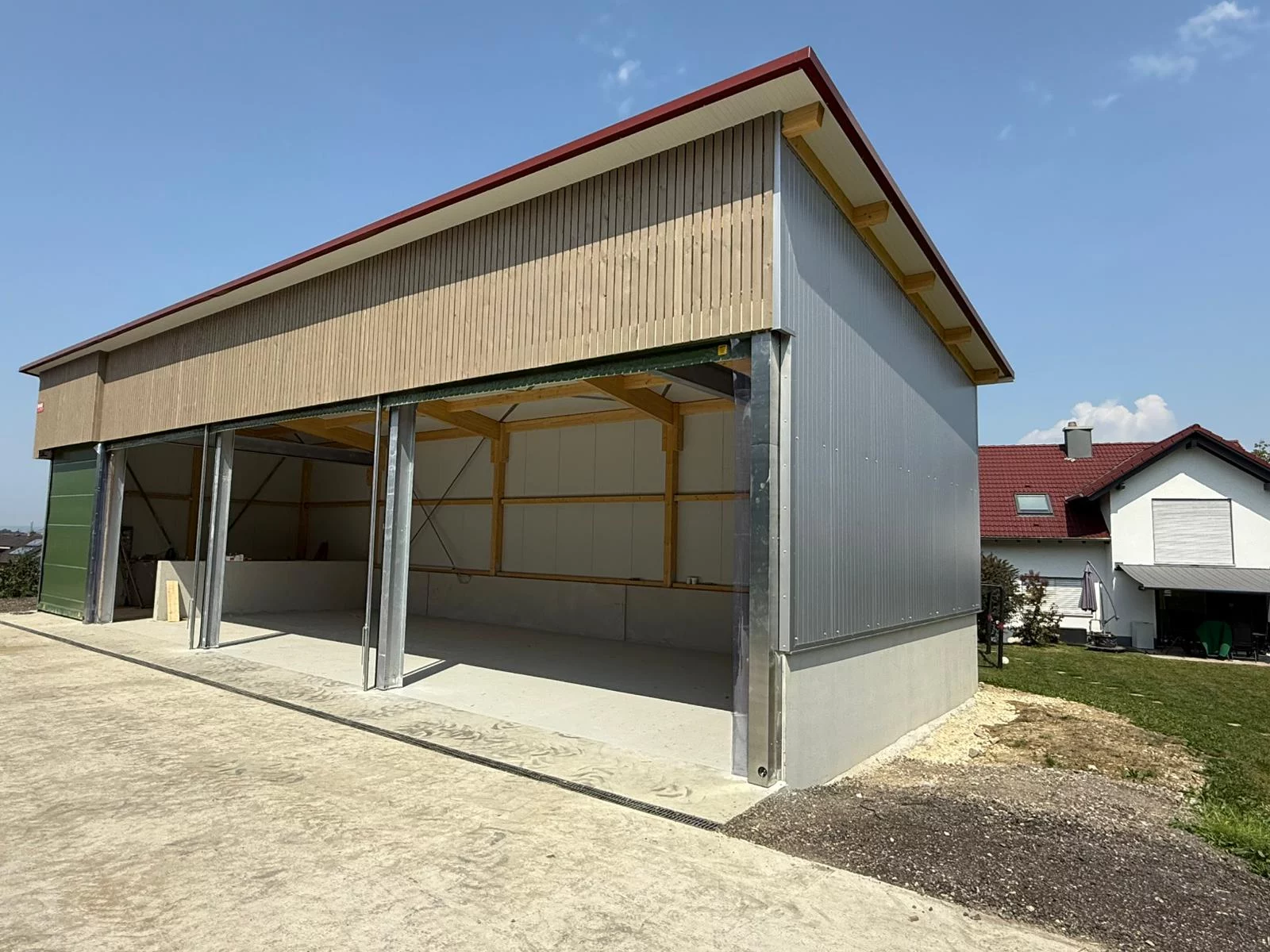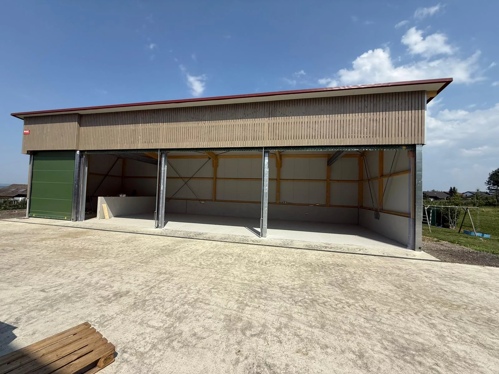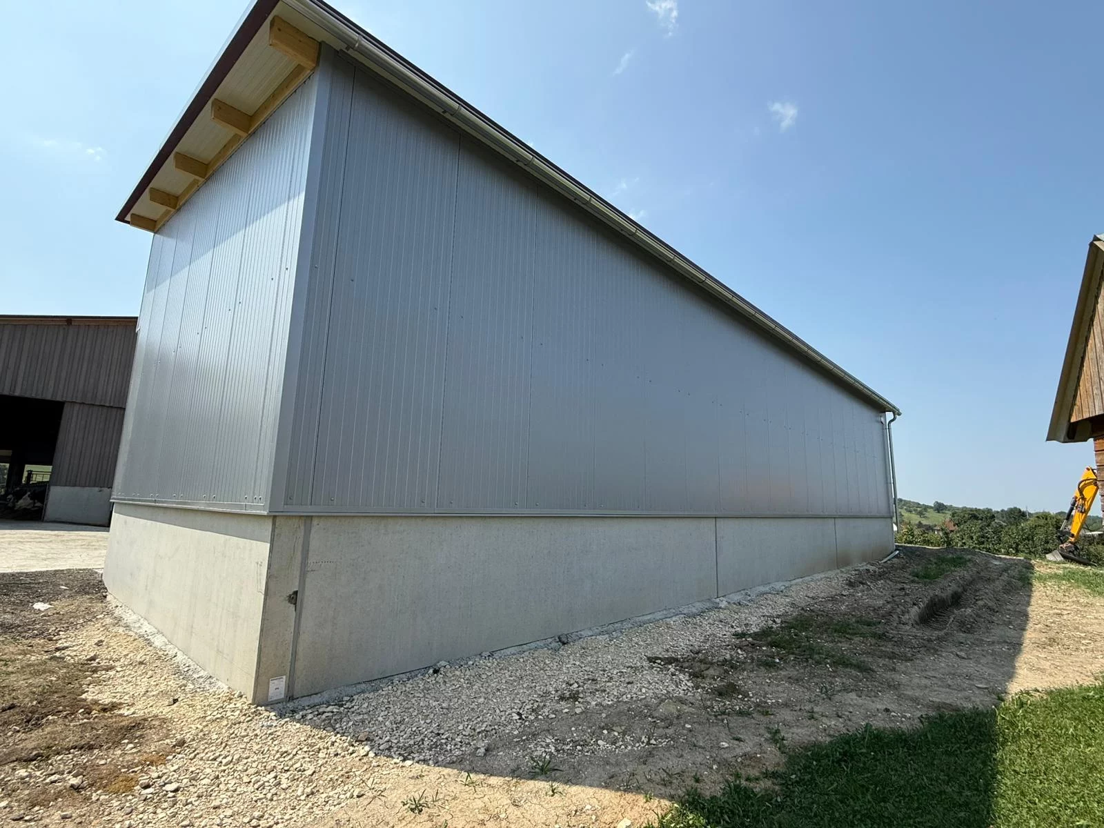 Bei der Familie Müller in Schlat durften wir nach dem erfolgreichen Stallneubau nun auch den nächsten Schritt begleiten – den Bau einer modernen Futterlagerhalle mit automatischer Fütterung. Das Gebäude beeindruckt durch eine funktionale Pultdachkonstruktion mit einer großflächig öffnenden Längsseite am Pultfirst, die eine optimale Belichtung und Belüftung ermöglicht. Die übrigen drei Gebäudeseiten sind mit einer gedämmten Sandwichfassade ausgeführt. Das Dach aus Sandwichelementen wird von verdeckten, eingehängten Pfetten getragen, was eine klare, aufgeräumte Innenansicht schafft. Die gesamte Tragkonstruktion steht stabil auf Stahlbetonfertigteilwänden und sorgt für eine langlebige und wartungsarme Bauweise – perfekt abgestimmt auf die Anforderungen moderner landwirtschaftlicher Betriebe.