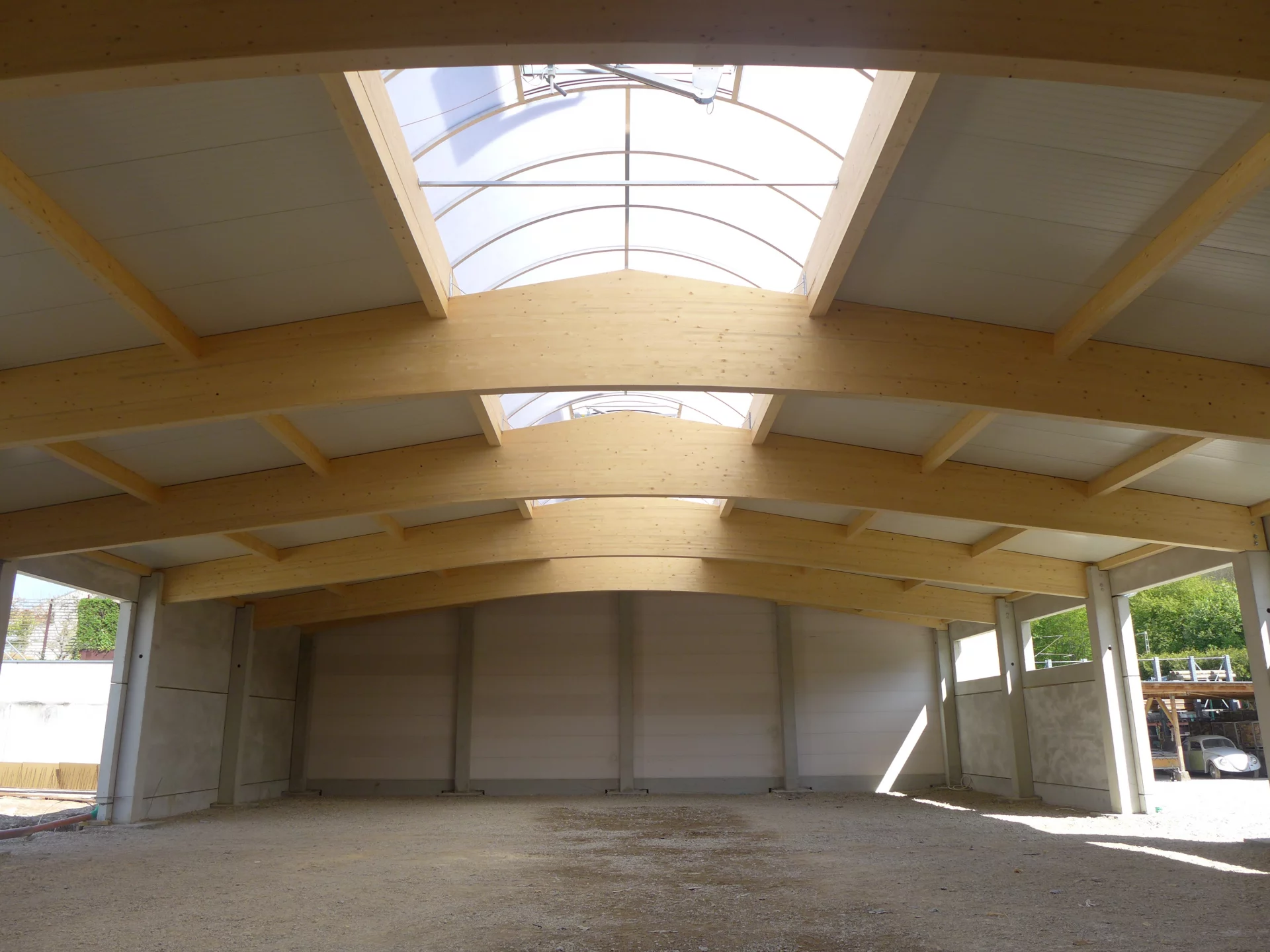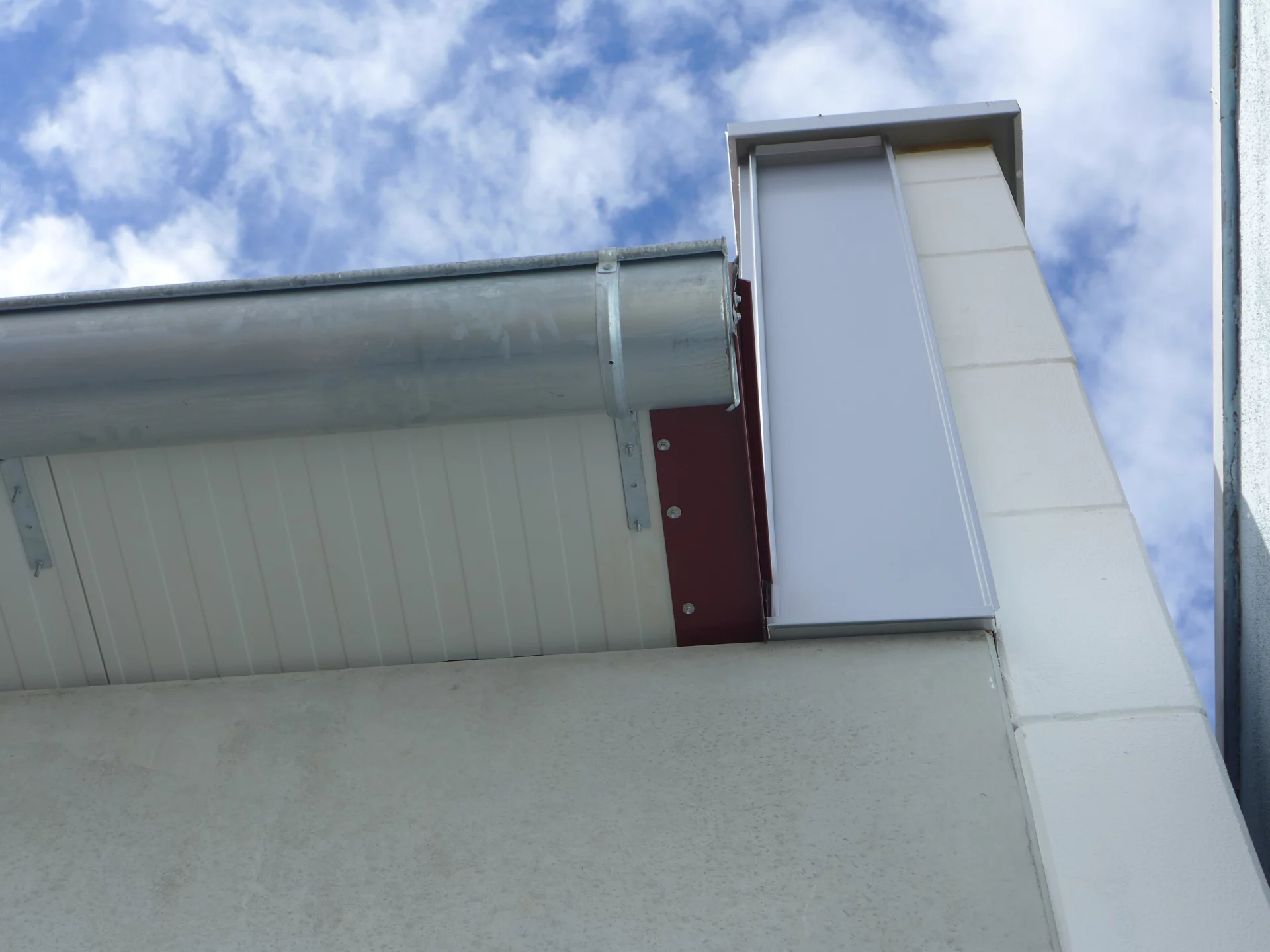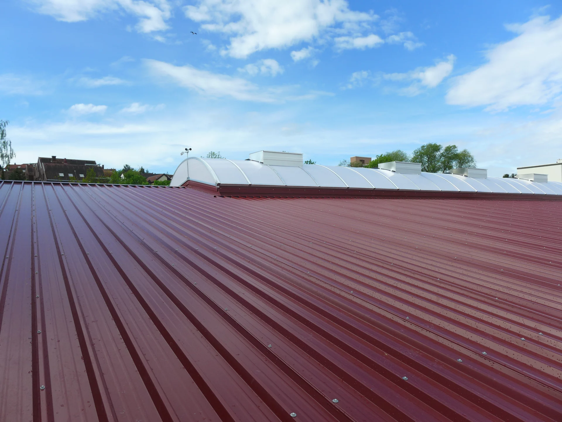 Für den Betrieb Rudolf in Weinstadt entstand eine robuste Gewerbe- und Industriehalle, die hohe Anforderungen an Tragfähigkeit und Langlebigkeit erfüllt. Die Konstruktion setzt auf massive Stahl-Betonstützen und vorgesetzten massiven Wandelementen, die der Halle ihre solide Grundstruktur verleihen. Das Dach wurde als Sandwichdach auf eingehängten Pfetten ausgeführt und gewährleistet so eine zuverlässige Dämmwirkung bei gleichzeitig langlebigem Aufbau. Integrierte RWA-Klappen sorgen im Bedarfsfall für eine effektive Rauchabführung und eine geregelte Belüftung des Halleninneren. Die Dachverkleidung aus Trapezblech in einem markanten Dunkelrot setzt einen bewussten gestalterischen Akzent und verleiht der Halle ein eigenständiges, industrielles Erscheinungsbild.
