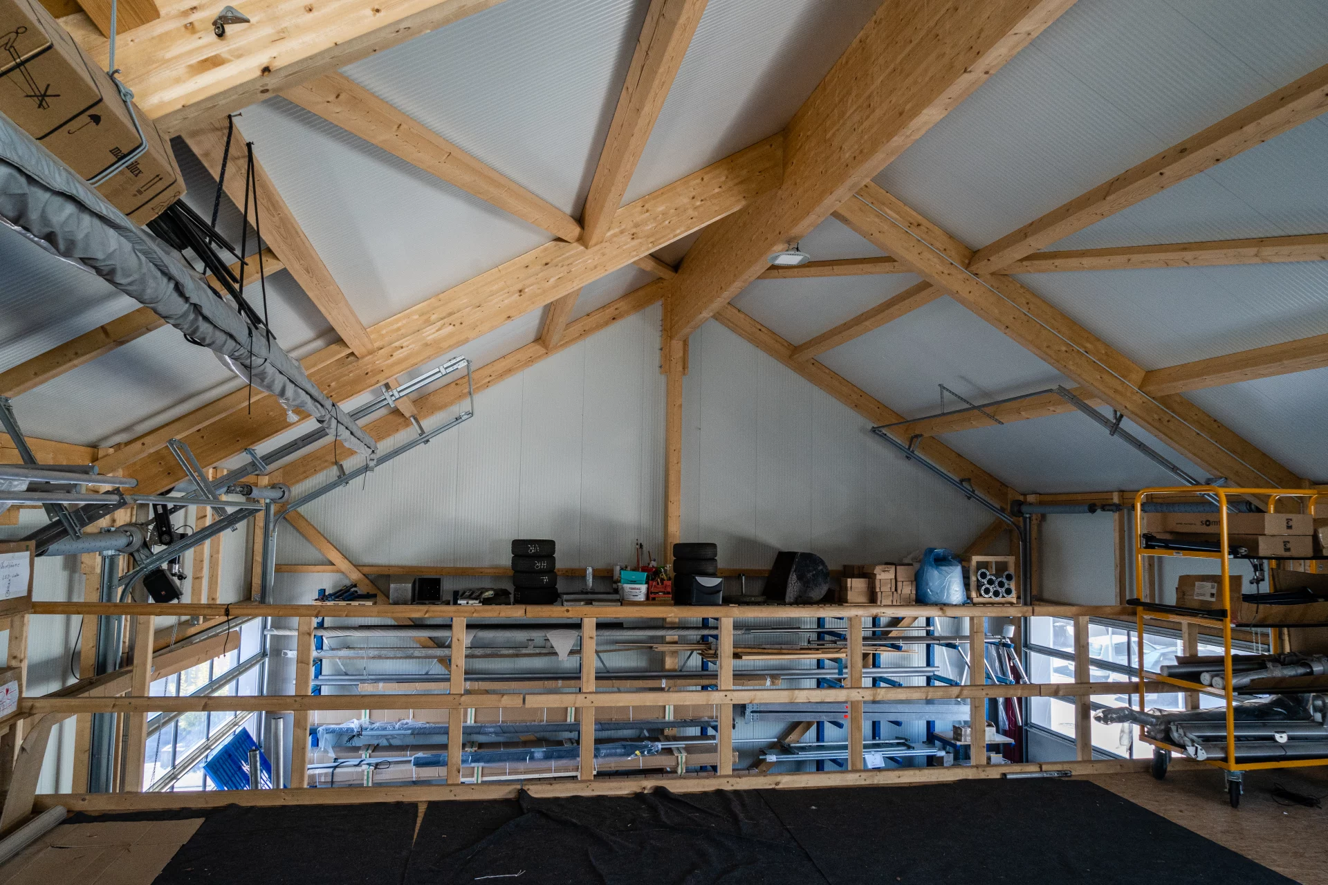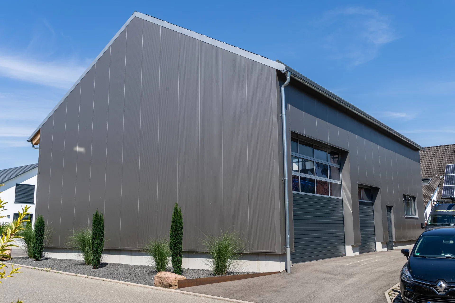 Für den Handwerksbetrieb Seeger in Nürtingen entstand eine moderne Gewerbehalle für Konfektionierung und Lagerung von Sonnenschutzsystemen. Aufgrund der Lage am angrenzenden Wohngebiet wurde die Halle mit einer relativ steilen Dachneigung ausgeführt, um sich harmonisch in die Umgebung einzufügen. Die Sandwichfassade und das Sandwichdach sorgen für optimale Dämmwerte und eine langlebige Gebäudehülle. Zwei Sektionaltore ermöglichen eine komfortable Zufahrt und flexible Nutzung der Hallenfläche. Teilbereiche sind mit einem Zwischengeschoss ausgestattet, das zusätzlichen Stauraum bietet. Eine kleine Anschleppung an der Giebelseite ergänzt das funktionale Gesamtkonzept. Das Ergebnis ist eine durchdachte, energieeffiziente und architektonisch ansprechende Halle, die perfekt auf die Anforderungen des Handwerksbetriebs abgestimmt ist.