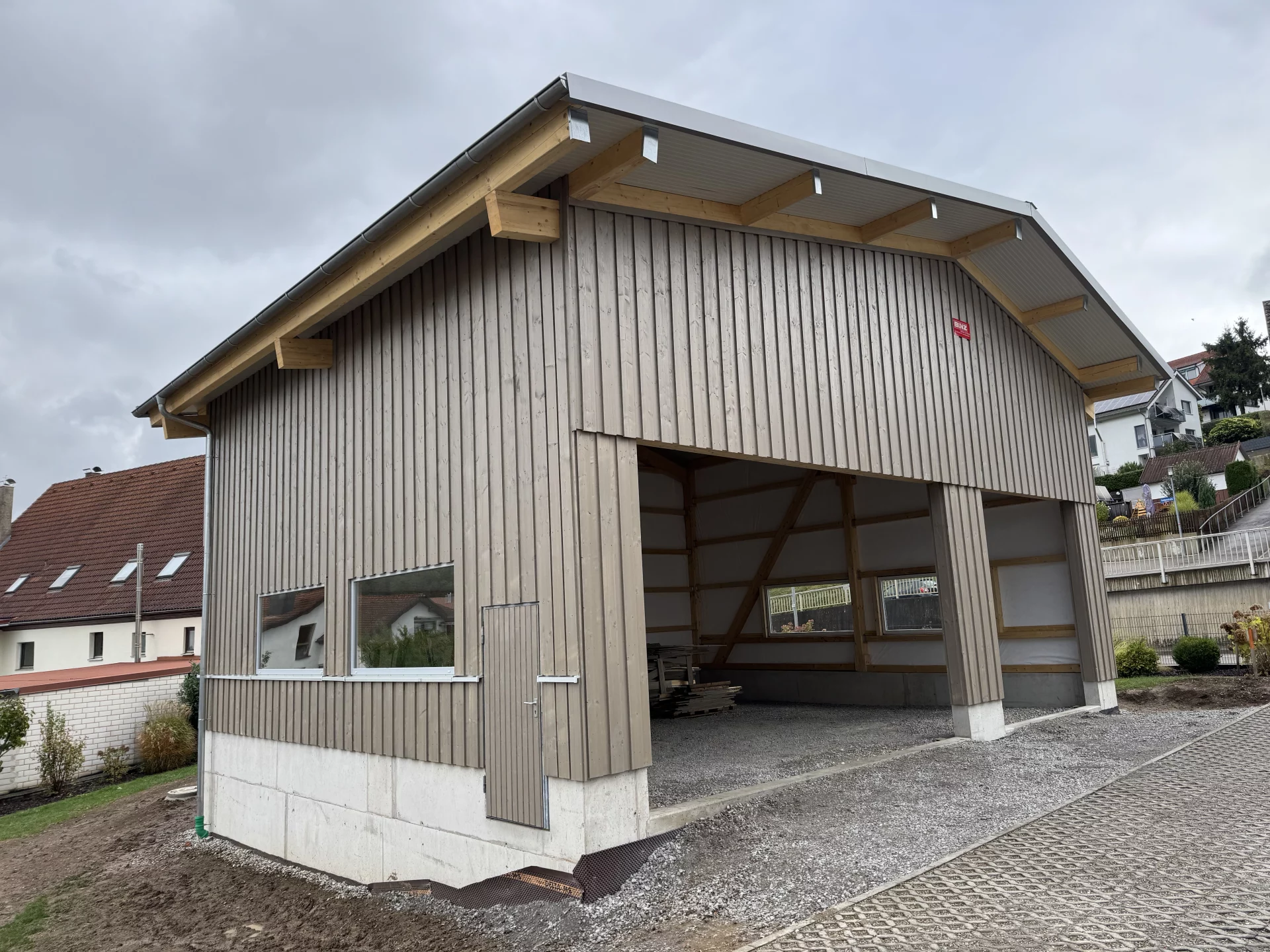 Für den Betrieb Sorg in Hüttlingen entstand ein modernes Garagen- und Multifunktionsgebäude, das geschickt in eine innerörtliche Baulücke integriert wurde. Das Gebäude überzeugt durch eine durchdachte Planung mit giebelseitiger Einfahrt über ein breites Doppelgaragentor sowie ein zusätzliches Einzeltor. Die elegante BINZ-Color-Fassade in Effektgrau, kombiniert mit großen Dachüberständen und einer hohen Gebäudehöhe, schafft vielseitige Nutzungsmöglichkeiten.