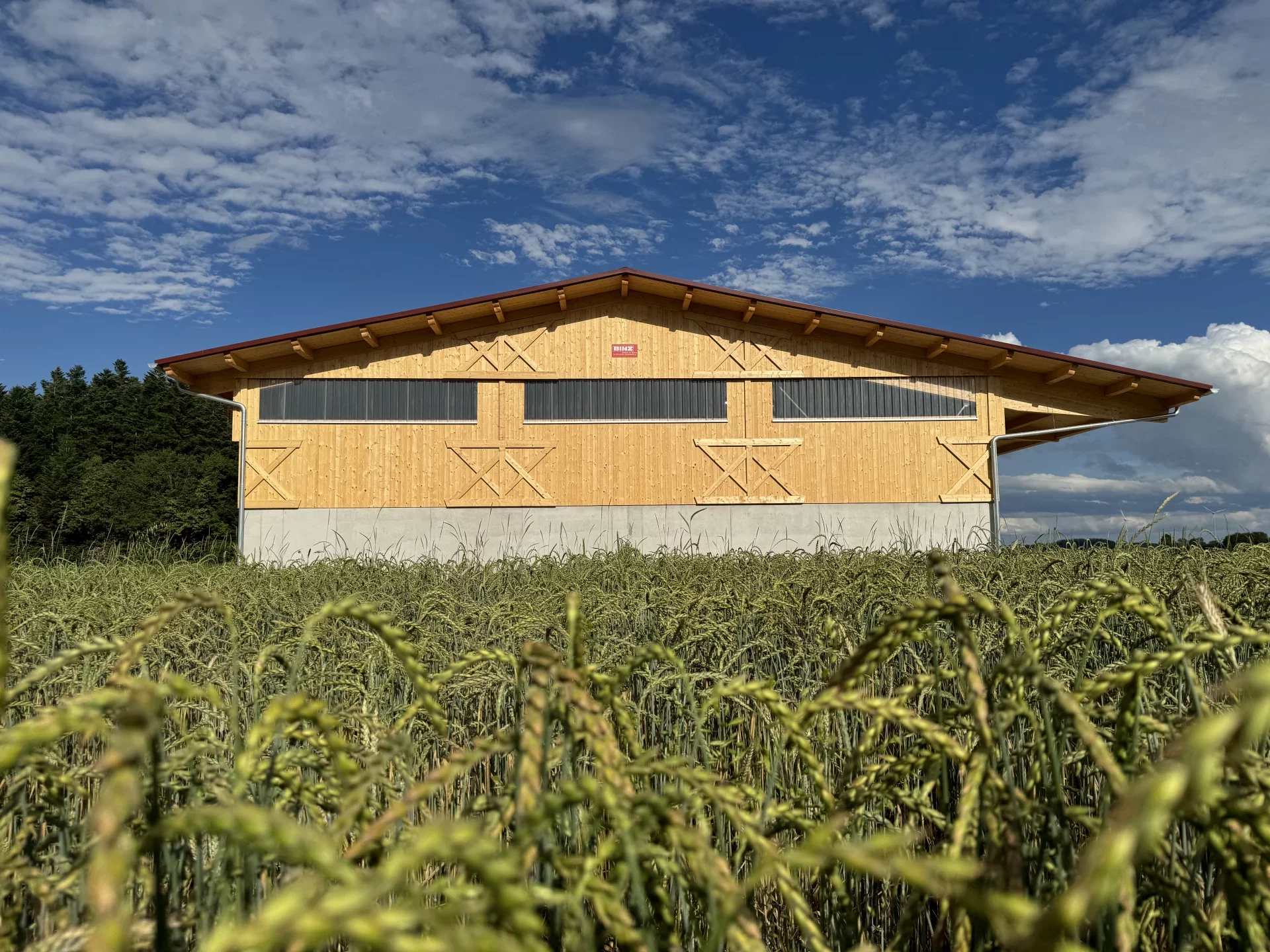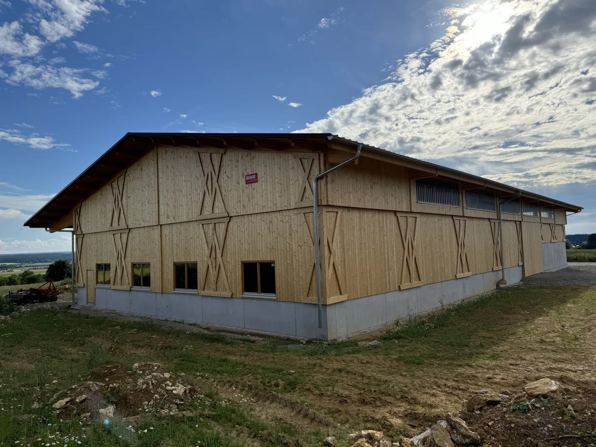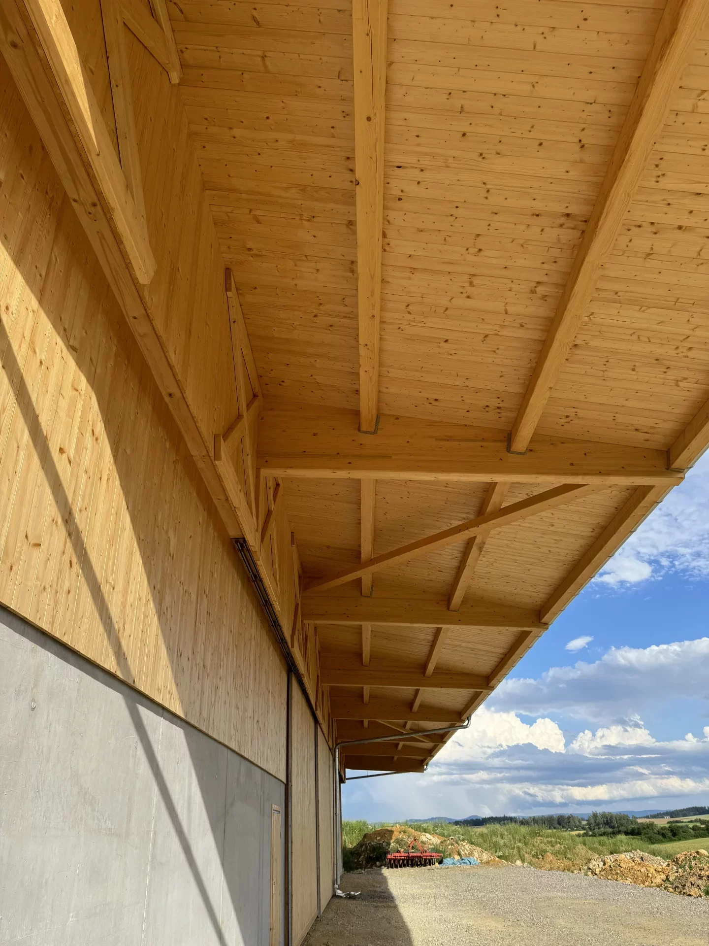 In Dunningen-Seedorf entstand im Außenbereich eine beeindruckende landwirtschaftliche Mehrzweckhalle, die Funktionalität, Langlebigkeit und ästhetische Holzarchitektur vereint. Die tragende Konstruktion mit über 25 m langen Hauptträgern wurde speziell für die hohen örtlichen Schneelasten konzipiert und garantiert maximale Stabilität. Die Fassade aus Nut- und Federschalung in farbloser BINZ-Color-Ausführung verleiht dem Gebäude eine natürliche, warme Anmutung und sorgt für einen harmonischen Gesamteindruck.