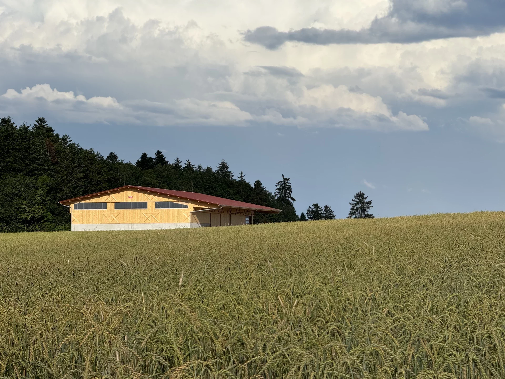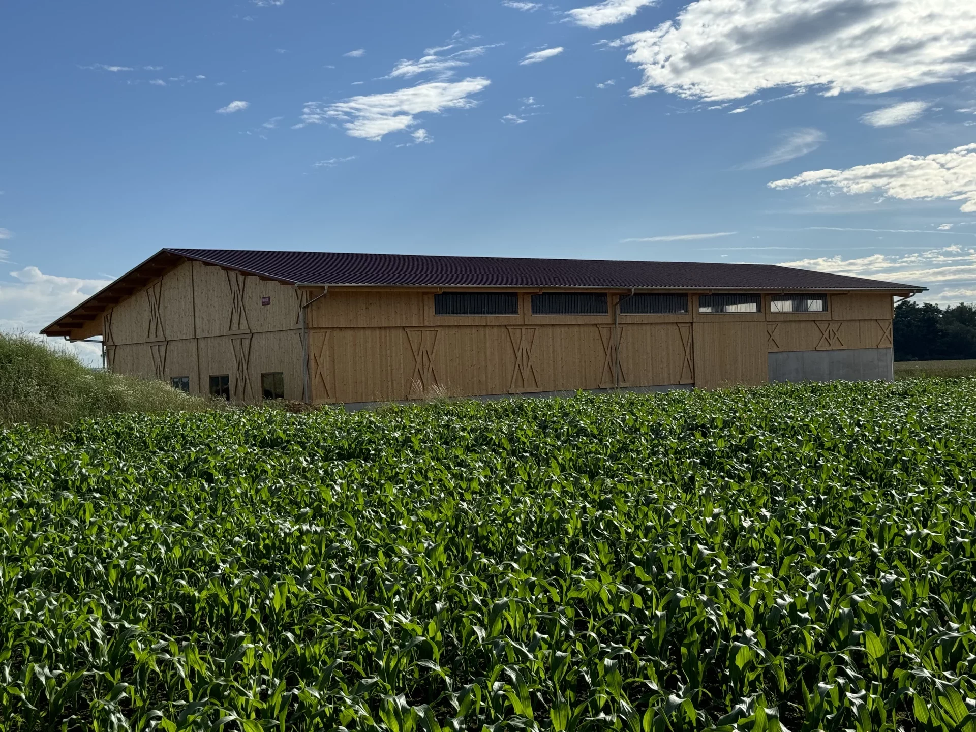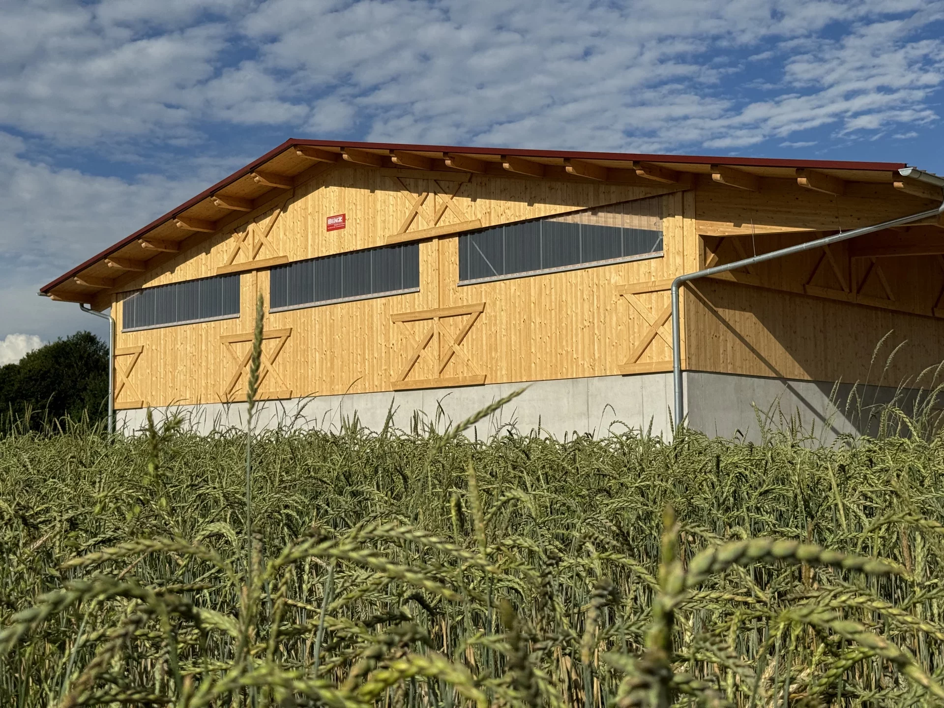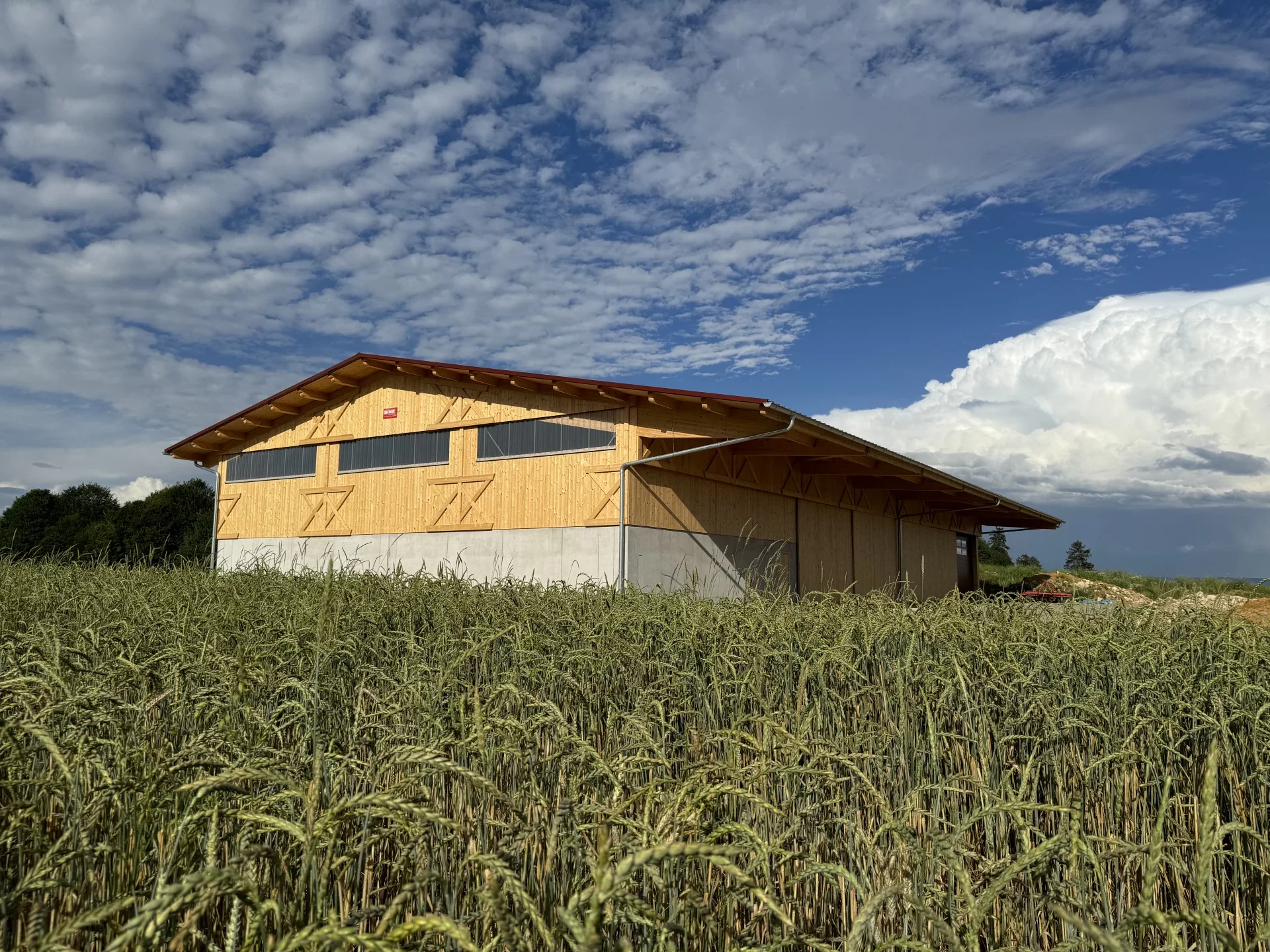 In Dunningen-Seedorf entstand im Außenbereich eine beeindruckende landwirtschaftliche Mehrzweckhalle, die Funktionalität, Langlebigkeit und ästhetische Holzarchitektur vereint. Die tragende Konstruktion mit über 25 m langen Hauptträgern wurde speziell für die hohen örtlichen Schneelasten konzipiert und garantiert maximale Stabilität. Die Fassade aus Nut- und Federschalung in farbloser BINZ-Color-Ausführung verleiht dem Gebäude eine natürliche, warme Anmutung und sorgt für einen harmonischen Gesamteindruck.