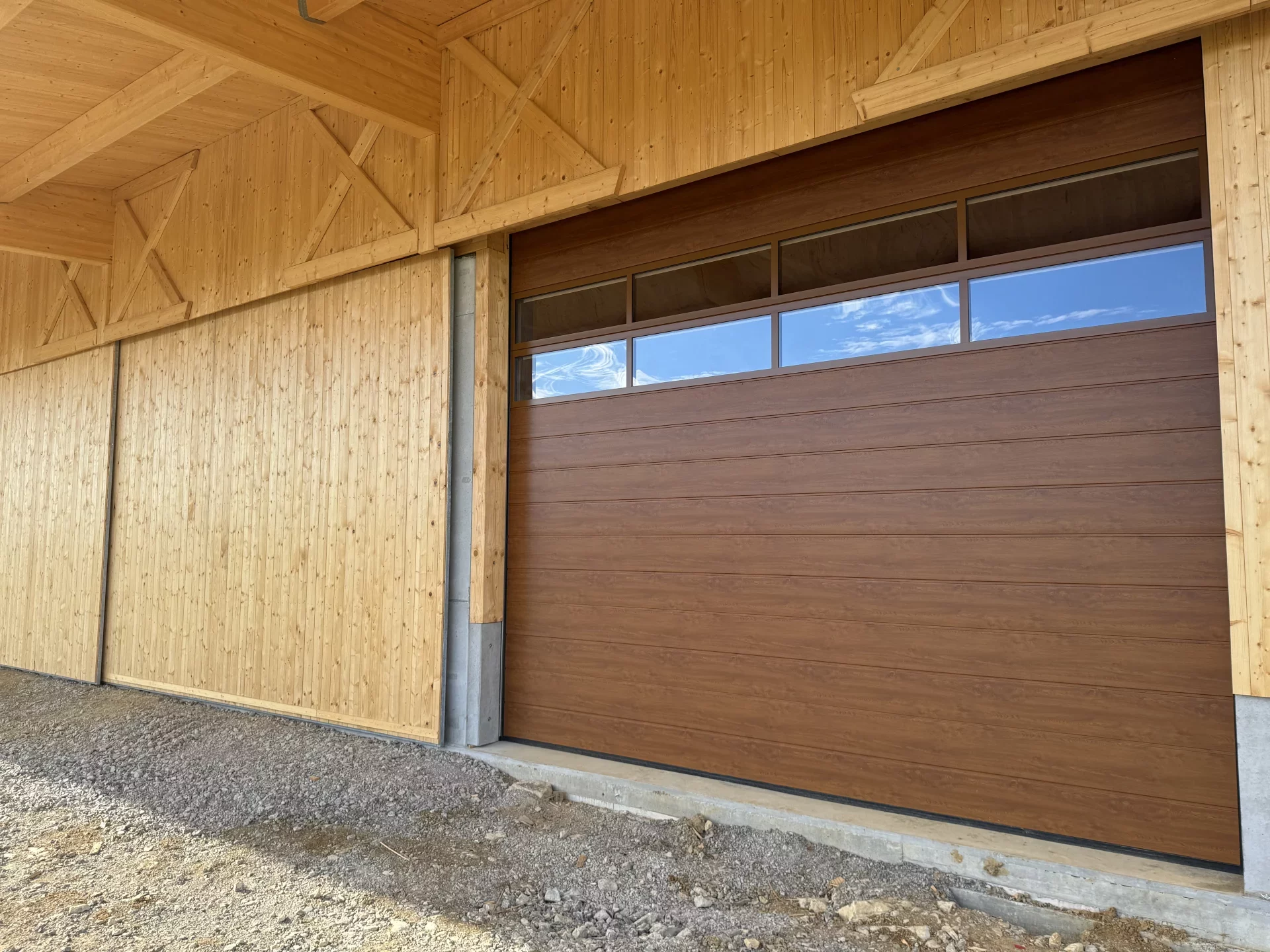 Die Pfettenkopfgestaltung sowie der verkleidete Dachüberstandsbereich, ebenfalls in farbloser BINZ-Color-Nut- und Federschalung, unterstreichen die hochwertige handwerkliche Ausführung. An der Vordachseite ermöglichen große, bis zu 12 m stützenfreie Einfahrten maximale Flexibilität in der Nutzung. Schiebetore auf einem zweiläufigen Schienensystem und ein zusätzliches Sektionaltor schaffen vielseitige Zugänge. Im angrenzenden Werkstattbereich sorgen Echtglasfenster für hervorragende Lichtverhältnisse und ein angenehmes Arbeitsumfeld.