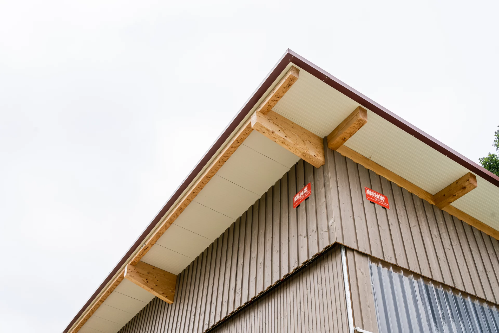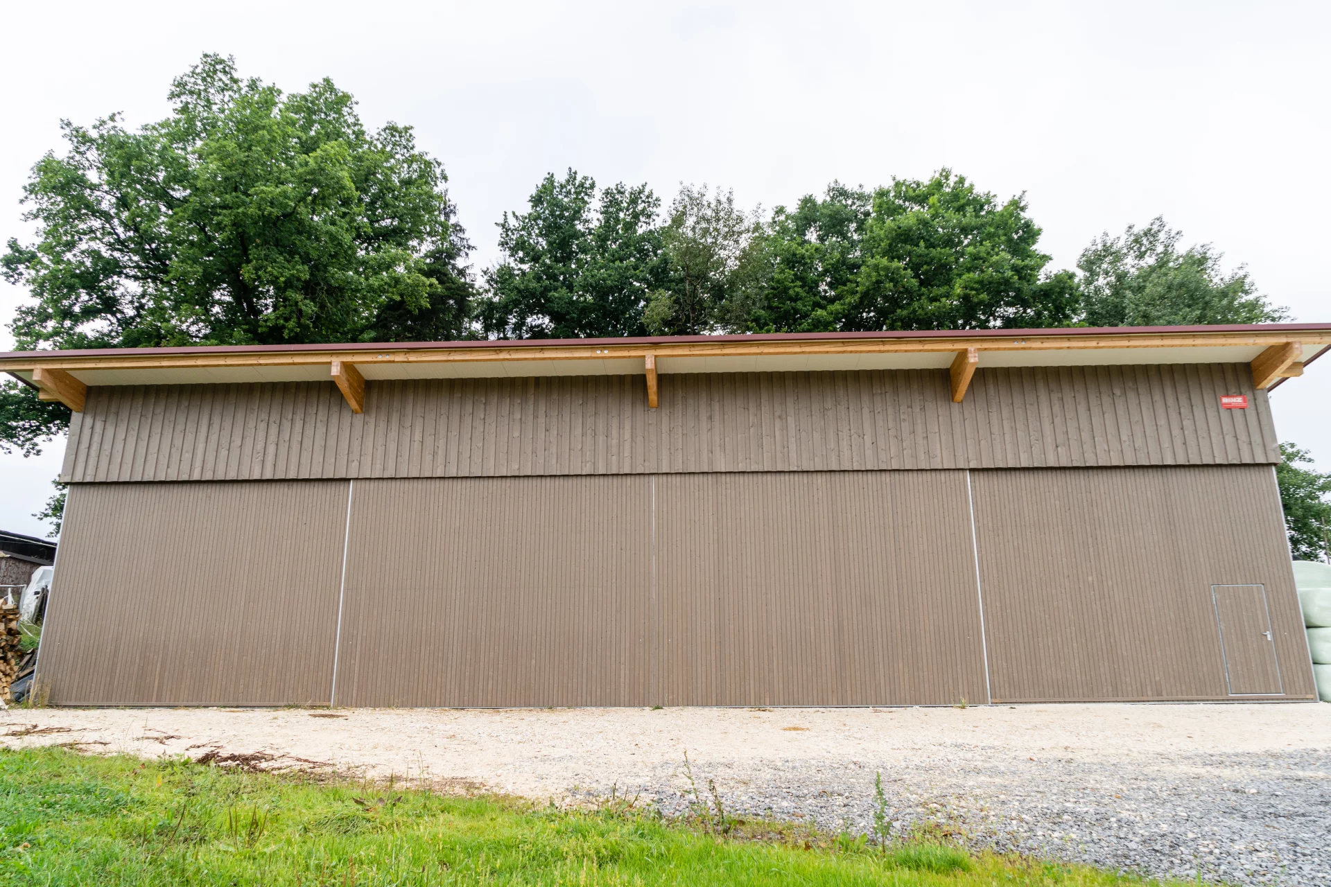 Für den landwirtschaftlichen Betrieb Vogler entstand in Espachweiler eine Mehrzweckhalle mit den Maßen 12 x 24 Metern, die durch ihre klare Gestaltung und hochwertige Ausführung überzeugt. Die Halle bietet vielseitige Nutzungsmöglichkeiten – von Lagerung über Maschinenunterstellung bis hin zu saisonalen Arbeitsbereichen. An der Traufenseite sowie an einer Einfahrtsseite ermöglichen robuste Schiebetore eine komfortable Nutzung und flexible Zugänge. Die BINZ-Color Fassade in Effekt-Grau verleiht dem Gebäude eine moderne, elegante Anmutung und sorgt zugleich für eine langlebige, witterungsbeständige Oberfläche. Durch die Kombination aus funktionaler Planung und präziser Holzbauweise entstand eine kompakte, wirtschaftliche Lösung für den landwirtschaftlichen Alltag.