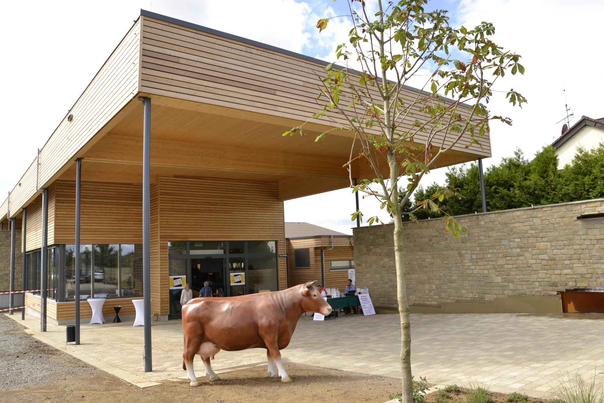 Die markante, 13 m weit auskragende Dachscheibe prägt das äußere Erscheinungsbild und schafft zugleich einen geschützten Eingangsbereich. Im Inneren überzeugen großzügige Räume, natürliche Materialien und eine präzise Ausführung. Großformatige Brettschichtholzdecken überspannen den Gastraum, während der Betonkern Technik, Treppenhaus und Aussteifung integriert.