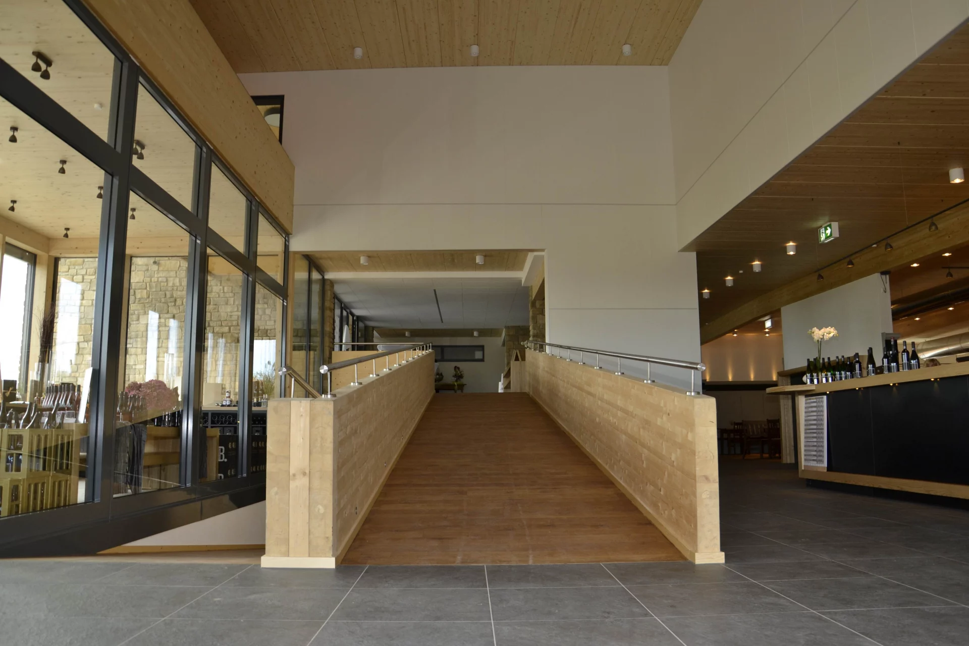 Besonderes Augenmerk galt dem Brandschutz und der Technikplanung: Die Lüftungsanlage der Großküche mit F90-Anforderung wurde in enger Zusammenarbeit mit Fachplanern entwickelt. Auch die barrierefreie Erschließung über elegante Rampen aus Brettschichtholzträgern sowie das großflächige „Glasauge“ über dem Fasslager zeugen von der Detailliebe und planerischen Kompetenz des Holzbau-Teams.